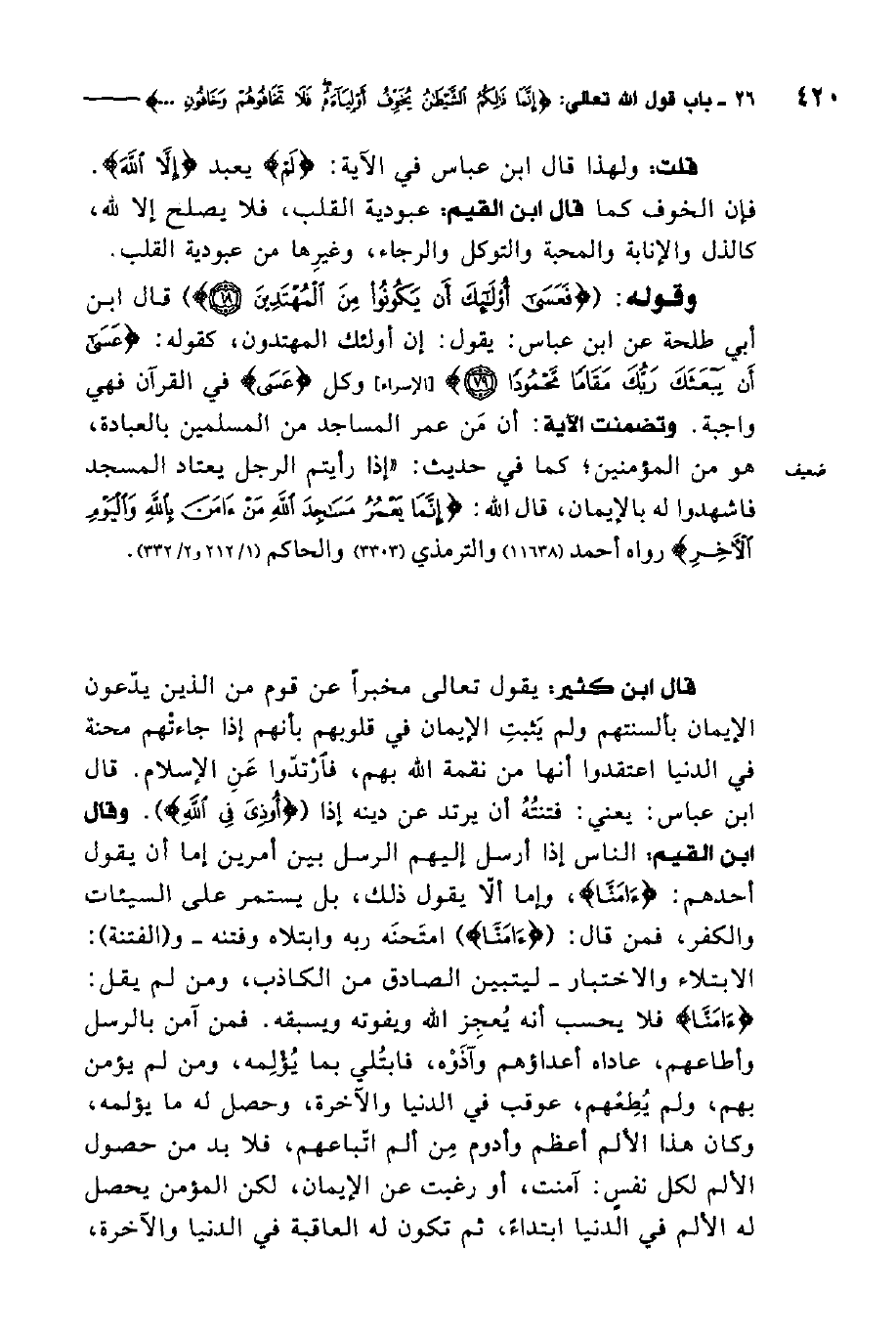 قلت: ولهذا قال ابن عباس في الآية: لم يعبد إلا الله، فإن الخوف كما قال ابن القيم: عبودية القلب، فلا يصلح إلا لله، كالذل والإنابة والمحبة والتوكل والرجاء وغيرها من عبودية القلب.