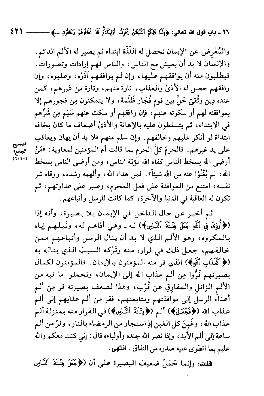 ثم أخبر عن حال الداخل في الإيمان بلا بصيرة، وأنه إذا أوذي في الله جعل فتنة الناس له، وهي أذاهم له، ونيلهم إياه بالمكروه، وهو الألم الذي لا بد أن ينال الرسل وأتباعهم ممن خالفهم، جعل ذلك في قراره منه وتركه السبب الذي يناله به كعذاب الله الذي فر منه المؤمنون بالإيمان. فالمؤمنون لكمال بصيرتهم فروا من ألم عذاب الله إلى الإيمان، وتحملوا ما فيه من الألم الزائل المفارق عن قرب، وهذا لضعف بصيرته فر من ألم أعداء الرسل إلى موافقتهم ومتابعتهم، ففر من ألم عذابهم إلى ألم عذاب الله، فجعل ألم فتنة الناس في الفرار منه بمنْزلة ألم عذاب الله، وغبن كل الغبن إذا استجار من الرمضاء بالنار، وفر من ألم ساعة إلى ألم الأبد، وإذا نصر الله جنده وأولياءه قال: إني كنت معكم والله عليم بما انطوى عليه صدره من النفاق انتهى.
