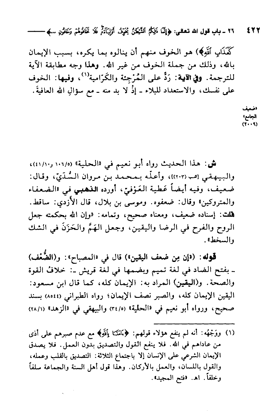 كَعَذَابِ اللَّهِ} ، هو الخوف منهم أن ينالوه بما يكره بسبب الإيمان بالله، وذلك من جملة الخوف من غير الله، وهذا وجه مطابقة الآية للترجمة، وفي الآية رد على المرجئة والكرامية، وفيها الخوف على نفسك، والاستعداد للبلاء إذ لا بد منه مع سؤال الله العافية.