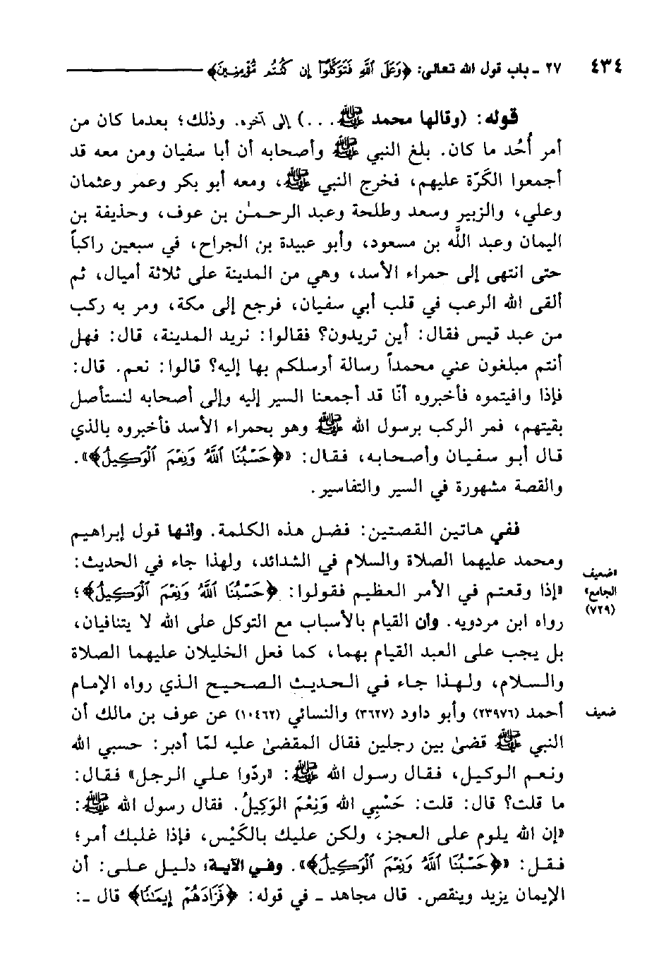 ففي هاتين القصتين فضل هذه الكلمة وأنها قول إبراهيم ومحمد عليهما الصلاة والسلام في الشدائد، ولهذا جاء في الحديث: "إذا وقعتم في الأمر العظيم فقولوا حسبنا الله ونعم الوكيل". رواه ابن مردويه وأن القيام بالأسباب مع التوكل على الله لا يتنافيان، بل يجب على العبد القيام بهما، كما فعل الخليلان عليهما الصلاة والسلام، ولهذا جاء في الحديث الصحيح الذي رواه الإمام أحمد وأبو داود والنسائي عن عوف بن مالك: "أن النبي صلى الله عليه وسلم قضى بين رجلين فقال المقضي عليه لما أدبر: حسبي الله ونعم الوكيل، فقال رسول الله صلى الله عليه وسلم ردوا علي الرجل. قال: ما قلت؟ قال: قلت: حسبي الله ونعم الوكيل فقال رسول الله صلى الله عليه وسلم: إن الله يلوم على العجز، ولكن عليك بالكيس فإذا غلبك أمر، فقل: حسبي الله ونعم الوكيل". وفي الآية دليل على أن الإيمان يزيد وينقص. قال مجاهد في قوله: {فَزَادَهُمْ إِيمَاناً} . قال:
