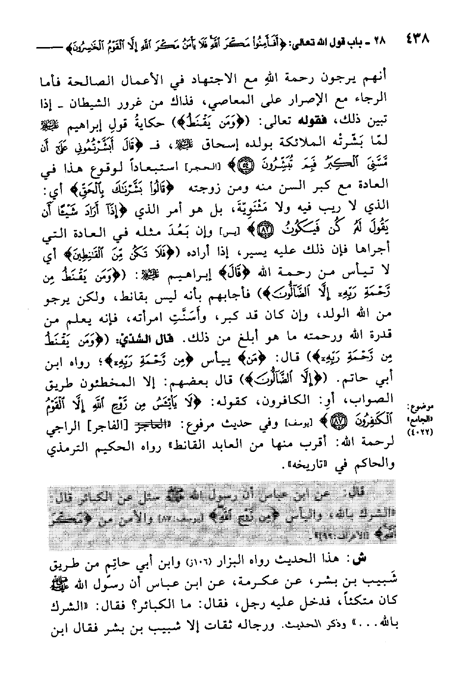 قال: عن ابن عباس أن رسول الله صلى الله عليه وسلم سئل عن الكبائرقال: "الشرك بالله، واليأس من روح الله، والأمن من مكر الله".