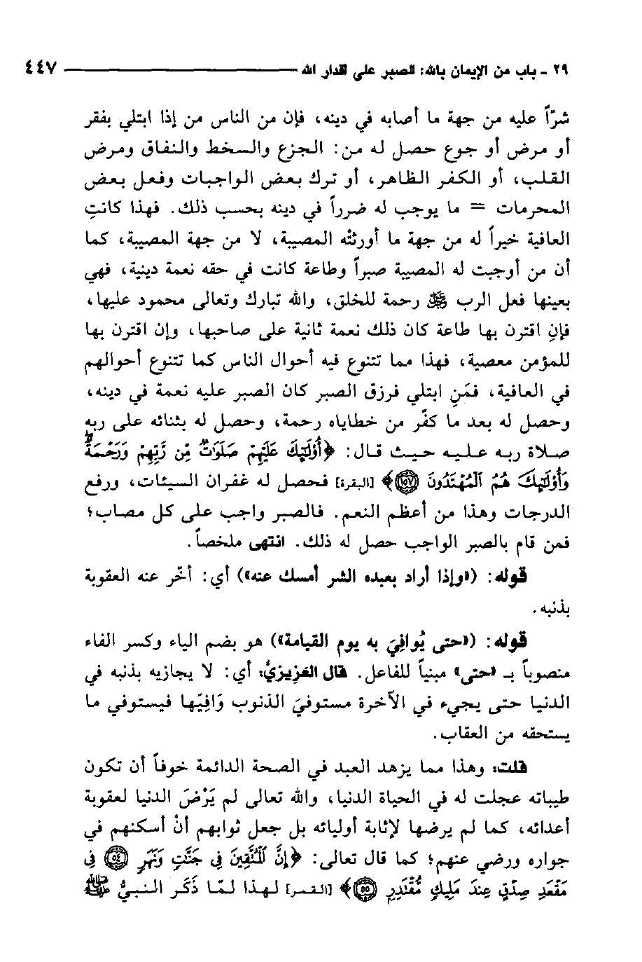 شرًّا عليه من جهة ما أصابه في دينه، فإن من الناس من إذا ابتلي بفقر أو مرض أو جوع حصل له من الجزع والسخط والنفاق ومرض القلب، أو الكفر الظاهر، أو ترك بعض الواجبات وفعل بعض المحرمات ما يوجب له ضررًا في دينه بحسب ذلك. فهذا كانت العافية خيرًا له من جهة ما أورثته المصيبة، لا من جهة المصيبة، كما أن من أوجبت له المصيبة صبرًا وطاعة كانت في حقه نعمة دينية، فهي بعينها فعل الرب عزّ وجل رحمة للخلق، والله تبارك وتعالى محمود عليها، فإن اقترن بها طاعة كان ذلك نعمة ثانية على صاحبها، وإن اقترن بها للمؤمن معصية، فهذا مما تتنوع فيه أحوال الناس كما تتنوع أحوالهم في العافية، فمن ابتلي فرزق الصبر كان الصبر عليه نعمة في دينه، وحصل له بعد ما كفر من خطاياه رحمة، وحصل له بثنائه على ربه صلاة ربه عليه حيث قال: {أُولَئِكَ عَلَيْهِمْ صَلَوَاتٌ مِنْ رَبِّهِمْ وَرَحْمَةٌ وَأُولَئِكَ هُمُ الْمُهْتَدُونَ} 1. فحصل له غفران السيئات، ورفع الدرجات وهذا من أعظم النعم. فالصبر واجب على كل مصاب; فمن قام بالصبر الواجب حصل له ذلك. انتهى ملخصًا.