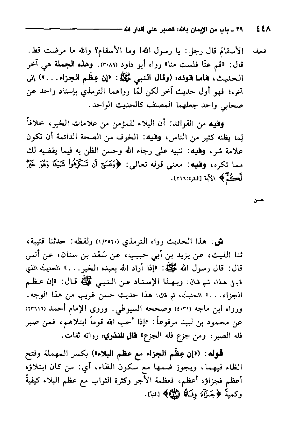 قال المصنف: وقال النبي صلى الله عليه وسلم: "إن عظم الجزاء مع عظم البلاء وإن الله إذا أحب قومًا ابتلاهم، فمن رضي فله الرضى، ومن سخط فله السخط" 3. حسنه الترمذي.