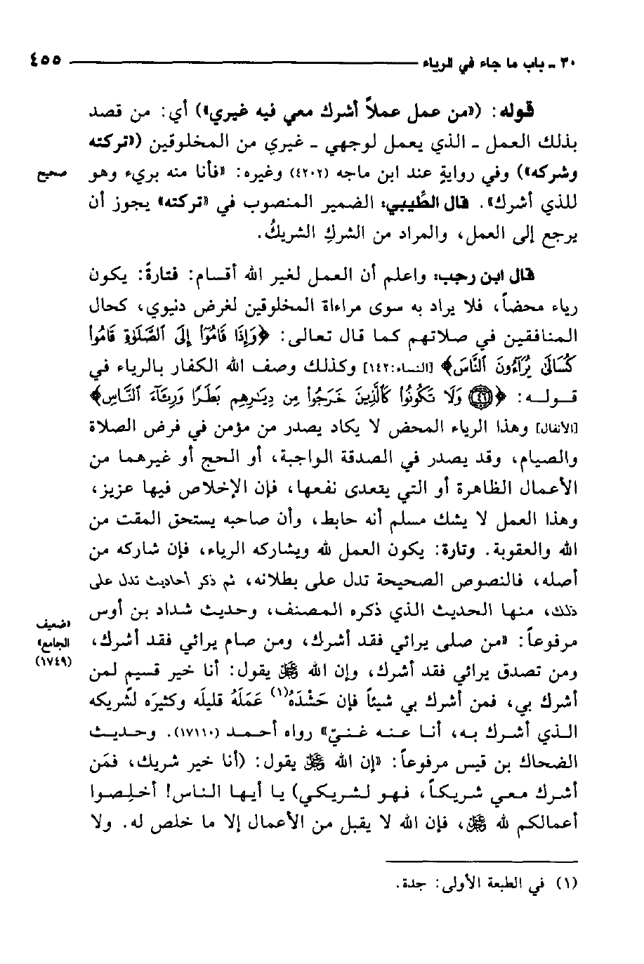 قال ابن رجب: "واعلم أن العمل لغير الله أقسام فتارة يكون رياء محضًا، فلا يراد به سوى مراءاة المخلوقين لغرض دنيوي، كحال المنافقين في صلاتهم كما قال تعالى: {وَإِذَا قَامُوا إِلَى الصَّلاةِ قَامُوا كُسَالَى يُرَاؤُونَ النَّاسَ} 2. وكذلك وصف الله الكفار بالرياء في قوله: {وَلا تَكُونُوا كَالَّذِينَ خَرَجُوا مِنْ دِيَارِهِمْ بَطَراً وَرِئَاءَ النَّاسِ} 3. وهذا الرياء المحض لا يكاد يصدر من مؤمن في فرض الصلاة والصيام، وقد يصدر في الصدقة الواجبة، أو الحج أو غيرهما من الأعمال الظاهرة أو التي يتعدى نفعها، فإن الإخلاص فيها عزيز، وهذا العمل لا يشك مسلم أنه حابط، وأن صاحبه يستحق المقت من الله والعقوبة، وتارة يكون العمل لله ويشاركه الرياء، فإن شاركه من أصله، فالنصوص الصحيحة تدل على بطلانه، ثم ذكر أحاديث تدل على ذلك، منها الحديث الذي ذكره المصنف، وحديث شداد بن أوس مرفوعًا: "من صلى يرائي فقد أشرك، ومن صام يرائي فقد أشرك، ومن تصدق يرائي فقد أشرك، وإن الله عزّ وجل يقول: أنا خير قسيم لمن أشرك بي فمن أشرك بي شيئًا فإن حشده4 وعمله قليله وكثيره لشريكه الذي أشرك به أنا عنه غني". رواه أحمد.