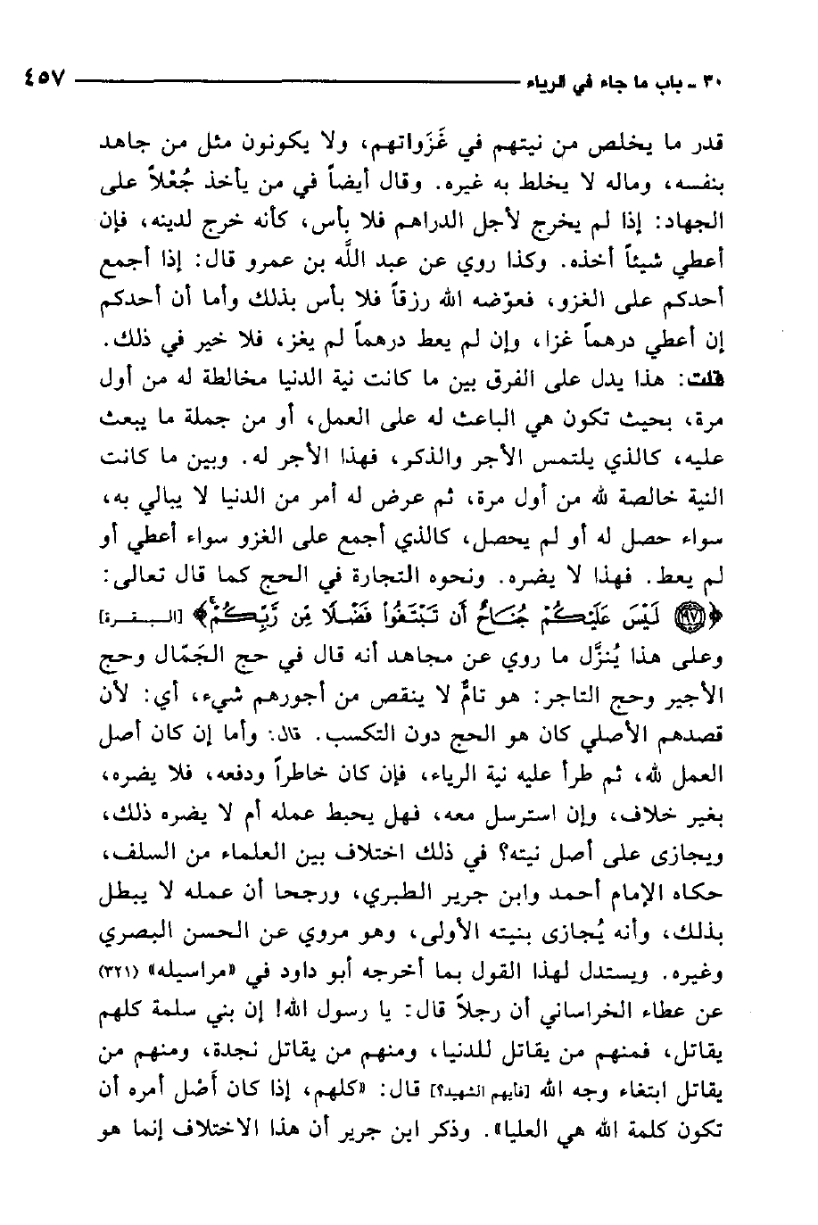 قلت: هذا يدل على الفرق بين ما كانت نية الدنيا مخالطة له من أول مرة، بحيث تكون هي الباعث له على العمل، أو من جملة ما يبعث عليه، كالذي يلتمس الأجر والذكر، فهذا الأجر له وبين ما كانت النية خالصة لله من أول مرة، ثم عرض له أمر من الدنيا لا يبالي به، سواء حصل له أو لم يحصل، كالذي أجمع على الغزو سواء أعطي أو لم يعط. فهذا لا يضره. ونحوه التجارة في الحج كما قال تعالى: {لَيْسَ عَلَيْكُمْ جُنَاحٌ أَنْ تَبْتَغُوا فَضْلاً مِنْ رَبِّكُمْ} 1. وعلى هذا يُنَزل ما روي عن مجاهد أنه قال في حج الجمال وحج الأجير وحج التاجر: هو تام لا ينقص من أجورهم شيء، أي: لأن قصدهم الأصلي كان هو الحج دون التكسب.