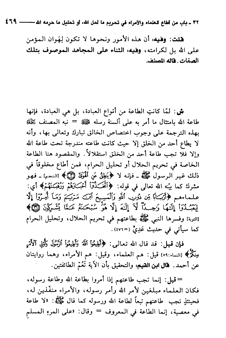 ش: لما كانت الطاعة من أنواع العبادة بل هي العبادة فإنها طاعة الله بامتثال ما أمر به على ألسنة رسله عليهم السلام ; نبه المصنف رحمه الله تعالى بهذه الترجمة على وجوب اختصاص الخالق تبارك وتعالى بها، وأنه لا يطاع أحد من الخلق إلا حيث كانت طاعته مندرجة تحت طاعة الله وإلا فلا تجب طاعة أحد من الخلق استقلالاً. والمقصود هنا الطاعة الخاصة في تحريم الحلال أو تحليل الحرام، فمن أطاع مخلوقًا في ذلك غير الرسول صلى الله عليه وسلم فإنه لا ينطق عن الهوى، فهو مشرك كما بينه الله تعالى في قوله: {اتَّخَذُوا أَحْبَارَهُمْ وَرُهْبَانَهُمْ} 1 أي: علماءهم {أَرْبَاباً مِنْ دُونِ اللَّهِ وَالْمَسِيحَ ابْنَ مَرْيَمَ وَمَا أُمِرُوا إِلاَّ لِيَعْبُدُوا إِلَهاً وَاحِداً لا إِلَهَ إِلاَّ هُوَ سُبْحَانَهُ عَمَّا يُشْرِكُونَ} 2. وفسرها النبي صلى الله عليه وسلم بطاعتهم في تحريم الحلال، وتحليل الحرام كما سيأتي في حديث عدي.
