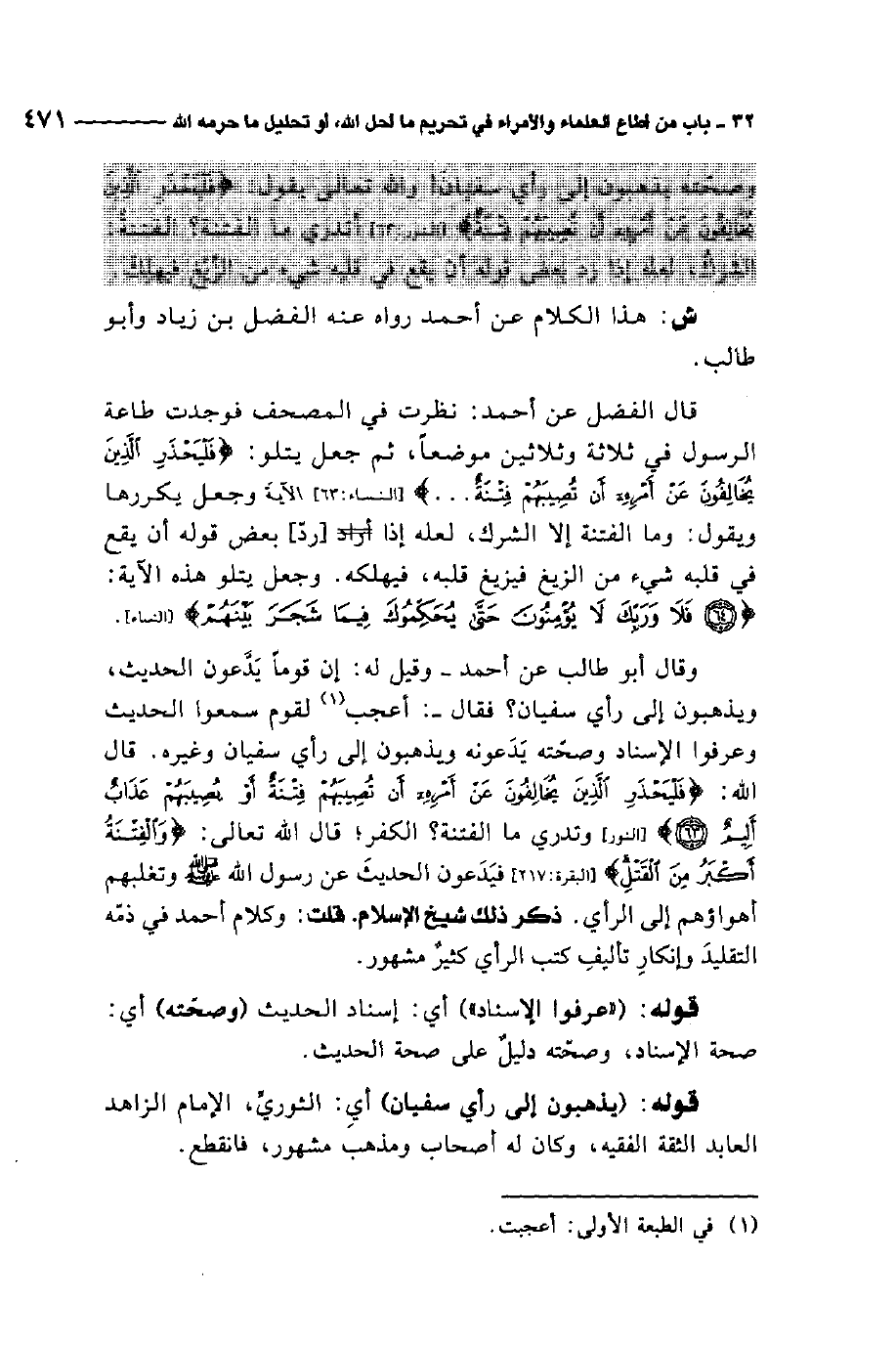 وصحته يذهبون إلى رأي سفيان والله تعالى يقول: {فَلْيَحْذَرِ الَّذِينَ يُخَالِفُونَ عَنْ أَمْرِهِ أَنْ تُصِيبَهُمْ فِتْنَةٌ} 1. أتدري ما الفتنة؟ الفتنة الشرك لعله إذا رد بعض قوله أن يقع في قلبه شيء من الزيغ فيهلك.
