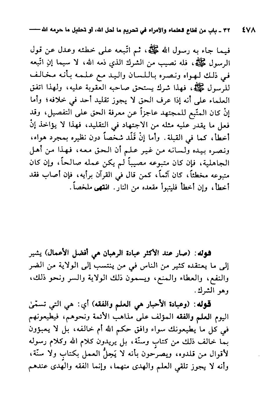 قال المصنف: وفيه تغير الأحوال إلى هذه الغاية [حتّى] صار عند الأكثر عبادة الرهبان هي أفضل الأعمال ويسمونها الولاية. وعبادة الأحبار هي العلم والفقه، ثم تغيرت الحال إلى أن عبد من ليس من الصالحين، وعبد بالمعنى الثاني من هو من الجاهلين.