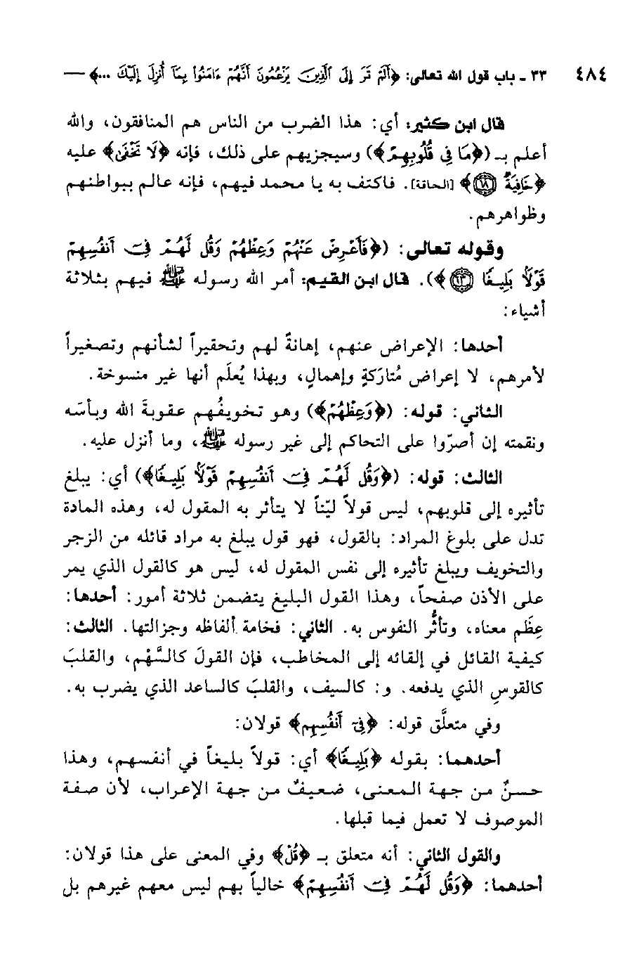 الثالث: قوله: وقل لهم في أنفسهم قولًا بليغًا، أي: يبلغ تأثيره إلى قلوبهم ليس قولاً لينًا لا يتأثر به المقول له، وهذه المادة تدل على بلوغ المراد بالقول، فهو قول يبلغ به مراد قائله من الزجر والتخويف ويبلغ تأثيره إلى نفس المقول له، ليس هو كالقول الذي يمر على الأذن صفحًا.