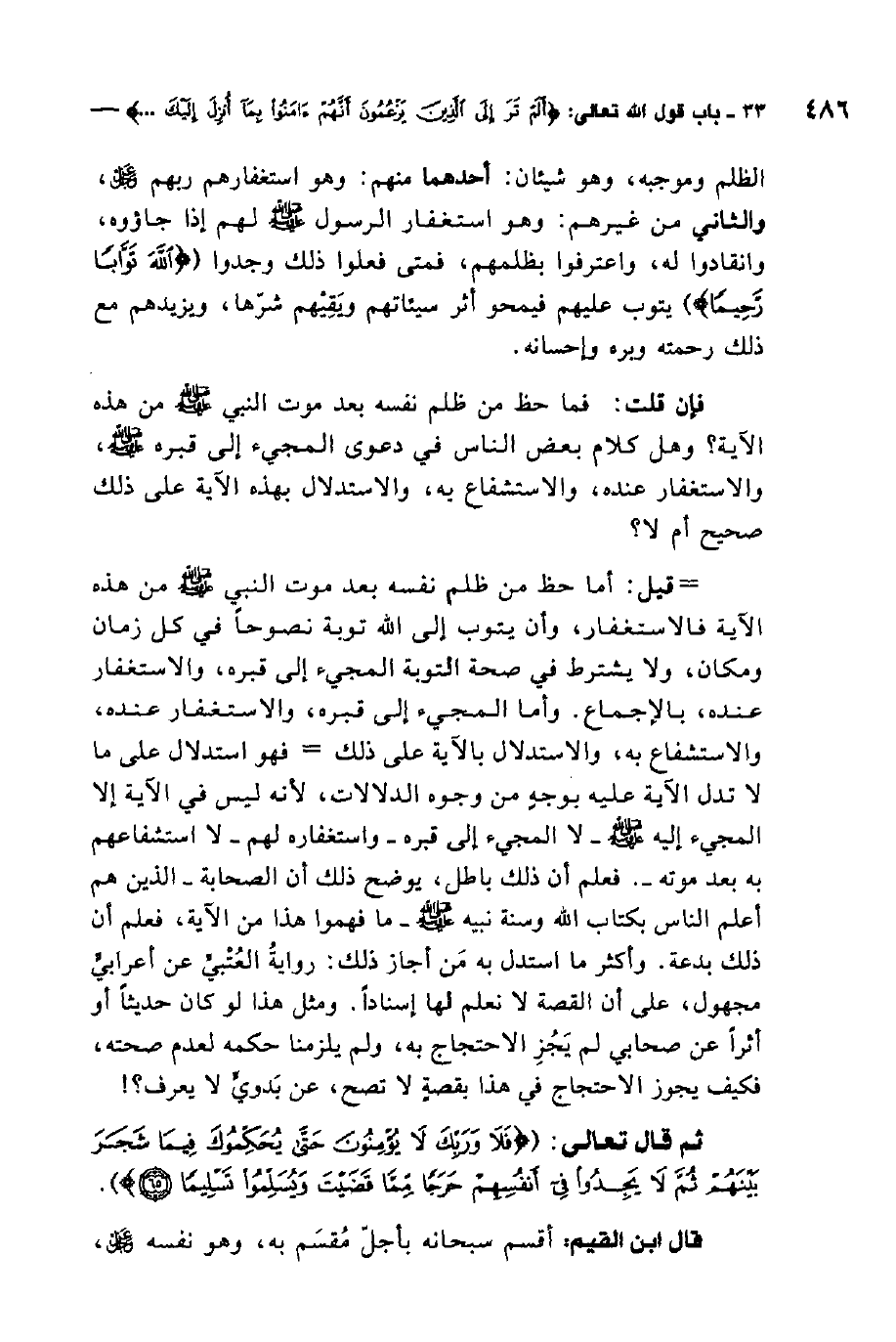 قيل: أما حظ من ظلم نفسه بعد موت النبي صلى الله عليه وسلم من هذه الآية فالاستغفار، وأن يتوب إلى الله توبة نصوحًا في كل زمان ومكان، ولا يشترط في صحة التوبة المجيء إلى قبره، والاستغفار عنده بالإجماع. وأما المجيء إلى قبره، والاستغفار عنده، والاستشفاع به، والاستدلال بالآية على ذلك، فهو استدلال على ما لا تدل الآية عليه بوجه من وجوه الدلالات، لأنه ليس في الآية إلا المجيء إليه صلى الله عليه وسلم لا المجيء إلى قبره، واستغفاره لهم، لاستشفاعهم به بعد موته، فعلم أن ذلك باطل، يوضح ذلك أن الصحابة الذين هم أعلم الناس بكتاب الله وسنة نبيه صلى الله عليه وسلم ما فهموا هذا من الآية، فعلم أن ذلك بدعة. وأكثر ما استدل به من أجاز ذلك رواية العتبي عن أعرابي مجهول على أن القصة لا نعلم لها إسنادًا. ومثل هذا لو كان حديثًا، أو أثرًا عن صحابي لم يجز الاحتجاج به، ولم يلزمنا حكمه لعدم صحته، فكيف يجوز الاحتجاج في هذا بقصة لا تصح عن بدوي لا يعرف؟!.