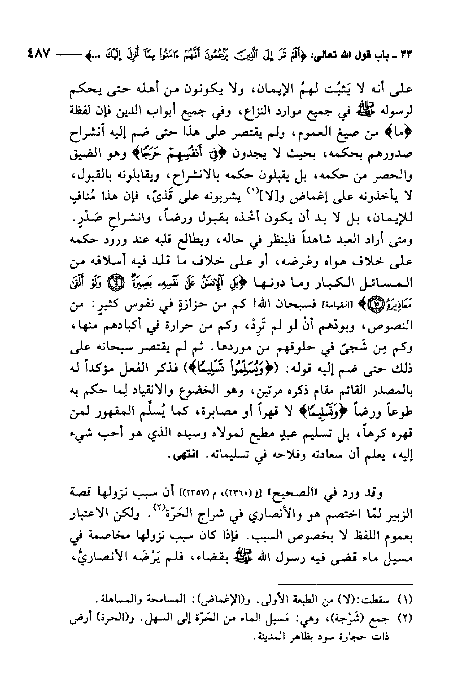 على أنه لا يثبت لهم الإيمان، ولا يكونون من أهله حتى يحكم لرسوله صلى الله عليه وسلم في جميع موارد النّزاع، وفي جميع أبواب الدين فإن لفظة "ما" من صيغ العموم، ولم يقتصر على هذا حتى ضم إليه انشراح صدورهم بحكمه، بحيث لا يجدون في أنفسهم حرجًا، وهو الضيق والحصر من حكمه، بل يقبلون حكمه بالانشراح، ويقابلونه بالقبول، لا يأخذونه على إغماض، و] لا] 1 يشربونه على قَذَى، فإن هذا مناف للإيمان، بل لا بد أن يكون أخذه بقبول ورضى، وانشراح صدر. ومتى أراد العبد شاهدًا فلينظر في حاله، ويطالع قلبه عند ورود حكمه على خلاف هواه وغرضه، أو على خلاف ما قلد فيه أسلافه من المسائل الكبار وما دونها {بَلِ الأِنْسَانُ عَلَى نَفْسِهِ بَصِيرَةٌ وَلَوْ أَلْقَى مَعَاذِيرَهُ} 2، فسبحان الله! كم من حزازة في نفوس كثير من النصوص، وبودهم أن لو لم ترد، وكم من حرارة في أكبادهم منها، وكم من شجى في حلوقهم من موردها، ثم لم يقتصر سبحانه على ذلك حتى ضم إليه قوله: {وَيُسَلِّمُوا تَسْلِيماً} 3 فذكر الفعل مؤكدًا له بالمصدر القائم مقام ذكره مرتين، وهو الخضوع والانقياد لما حكم به طوعًا ورضى وتسليما، لا قهرًا أو مصابرة، كما يسلم المقهور لمن قهره كرهًا، بل تسليم عبد مطيع لمولاه وسيده الذي هو أحب شيء إليه، يعلم أن سعادته وفلاحه في تسليماته. انتهى.