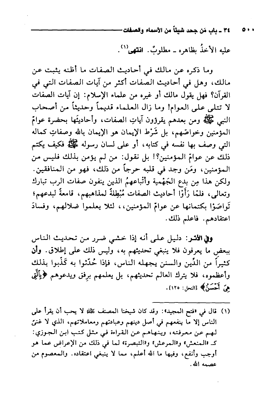وما ذكره عن مالك في أحاديث الصفات ما أظنه يثبت عن مالك، وهل في أحاديث الصفات أكثر من آيات الصفات التي في القرآن؟ فهل يقول مالك أو غيره من علماء الإسلام: إن آيات الصفات لا تتلى على العوام، وما زال العلماء قديمًا وحديثًا من أصحاب النبي صلى الله عليه وسلم ومن بعدهم يقرؤون آيات الصفات، وأحاديثها بحضرة عوام المؤمنين وخواصهم، بل شرط الإيمان هو الإيمان بالله، وصفات كماله التي وصف بها نفسه في كتابه، أو على لسان رسوله صلى الله عليه وسلم فكيف يكتم ذلك عن عوام المؤمنين؟! بل نقول: من لم يؤمن بذلك فليس من المؤمنين، ومن وجد في قلبه حرجًا من ذلك، فهو من المنافقين.