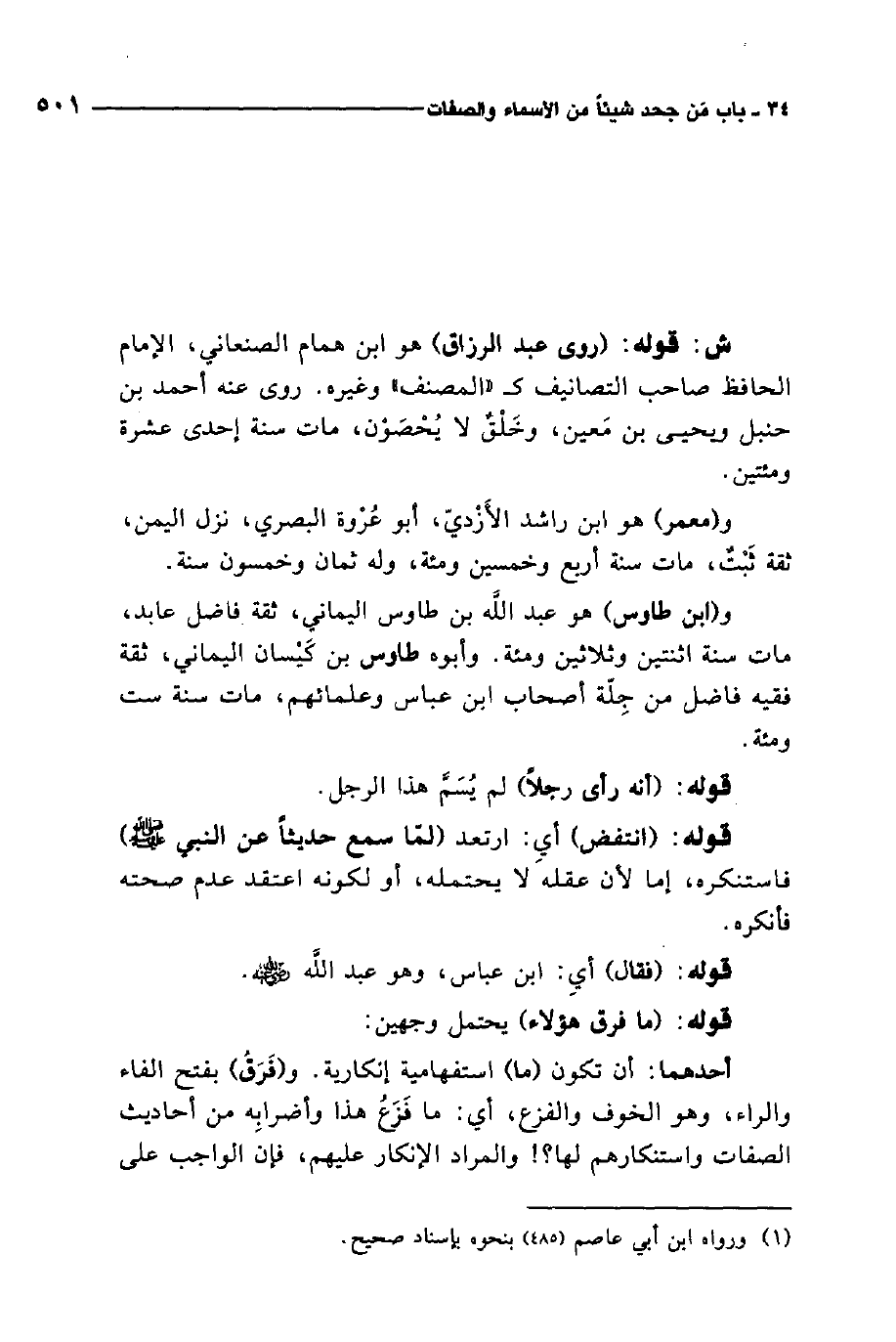 قال: وروى عبد الرزاق عن معمر عن [ابن] طاوس عن أبيه "عن ابن عباس أنه رأى رجلاً انتفض لما سمع حديثًا عن النبي صلى الله عليه وسلم في الصفات استنكارًا لذلك فقال: ما فرق هؤلاء يجدون رقة عند محكمه، ويهلكون عند متشابهه". انتهى.