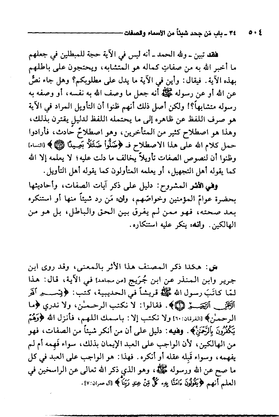 فقد تبين ولله الحمد أنه ليس في الآية حجة للمبطلين في جعلهم ما أخبر الله به من صفات كماله هو المتشابه، ويحتجون على باطلهم بهذه الآية، فيقال: وأين في الآية ما يدل على مطلوبكم؟ وهل جاء نص عن الله أو عن رسول الله صلى الله عليه وسلم أنه جعل ما وصف الله به نفسه، أو وصفه به رسوله متشابهًا؟! ولكن أصل ذلك أنهم ظنوا أن التأويل المراد في الآية هو صرف اللفظ عن ظاهره إلى ما يحتمله اللفظ لدليل يقترن بذلك، وهذا هو اصطلاح كثير من المتأخرين، وهو اصطلاح حادث، فأرادوا حمل كلام الله على هذا الاصطلاح فضلوا ضلالاً بعيدًا، وظنوا أن لنصوص الصفات تأويلاً يخالف ما دلت عليه، لا يعلمه إلا الله كما يقوله أهل التجهيل، أو يعلمه المتأولون كما يقوله أهل التأويل. وفي الأثر المشروح دليل على ذكر آيات الصفات، وأحاديثها بحضرة عوام المؤمنين وخواصهم، وأن من رد شيئًا منها أو استنكره بعد صحته، فهو ممن لم يفرق بين الحق والباطل، بل هو من الهالكين وأنه ينكر عليه استنكاره.