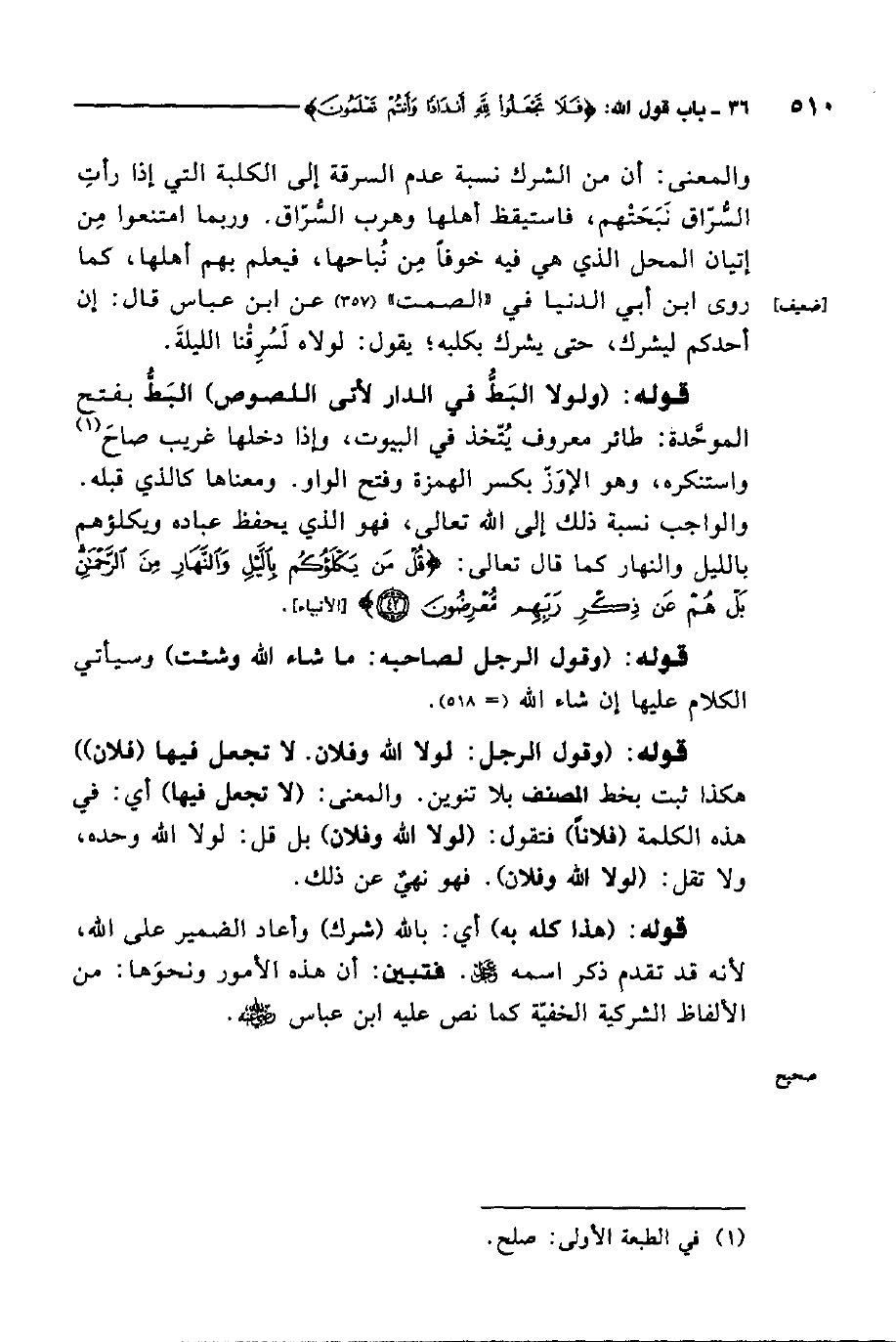 قوله: "ولولا البط في الدار لأتى اللصوص". البط بفتح الموحدة: طائر معروف يتخذ في البيوت، وإذا دخلها غريب صاح1 واستنكره، وهو الإوز بكسر الهمزة وفتح الواو ومعناها كالذي قبله. والواجب نسبة ذلك إلى الله تعالى، فهو الذي يحفظ عباده ويكلؤهم بالليل والنهار كما قال تعالى: {قُلْ مَنْ يَكْلأُكُمْ بِاللَّيْلِ وَالنَّهَارِ مِنَ الرَّحْمَنِ بَلْ هُمْ عَنْ ذِكْرِ رَبِّهِمْ مُعْرِضُونَ} 2.