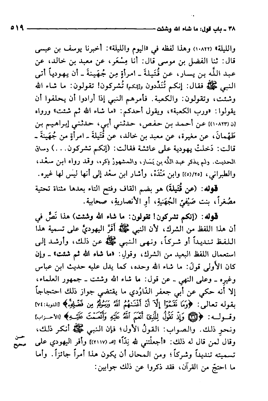 وقول: "ما شاء الله ثم شئت"، وإن كان الأولى قول: ما شاء الله وحده، كما يدل عليه حديث ابن عباس وغيره، وعلى النهي عن قول: ما شاء الله وشئت جمهور العلماء، إلا أنه حكي عن أبي جعفر الداودي ما يقتضي جواز ذلك احتجاجا بقوله تعالى: {وَمَا نَقَمُوا إِلاَّ أَنْ أَغْنَاهُمُ اللَّهُ وَرَسُولُهُ مِنْ فَضْلِهِ} 1. وقوله: {وَإِذْ تَقُولُ لِلَّذِي أَنْعَمَ اللَّهُ عَلَيْهِ وَأَنْعَمْتَ عَلَيْهِ} 2. ونحو ذلك. والصواب القول الأول، فإن النبي صلى الله عليه وسلم أنكر ذلك وقال لمن قال له ذلك: أجعلتني لله ندًّا. وأقر اليهودي على تسميته تنديدًا وشركا، ومن المحال أن يكون هذا أمرًا جائزًا. وأما ما احتج من القرآن، فقد ذكروا عن ذلك جوابين: