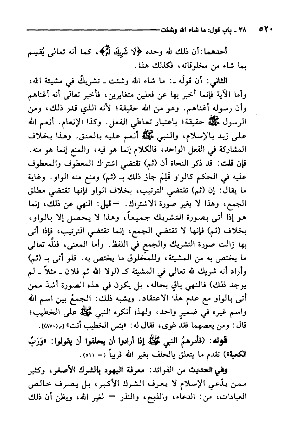 فإن قلت: قد ذكر النحاة أن "ثم" تقتضي اشتراك المعطوف والمعطوف عليه في الحكم كالواو فلم جاز ذلك بثم؟ ومنع منه الواو. وغاية ما يقال: إن "ثم" تقتضي الترتيب بخلاف الواو، فإنها تقتضي مطلق الجمع، وهذا لا يغير صورة الاشتراك قبل النهي عن ذلك، إنما هو إذا أتى بصورة التشريك جميعًا، وهذا لا يحصل إلا بالواو بخلاف ثم، فإنها لا تقتضي الجمع، إنما تقتضي الترتيب، فإذا أتى بها زالت صورة التشريك والجمع في اللفظ. وأما المعنى، فلله تعالى ما يختص به من المشيئة، وللمخلوق ما يختص به، فلو أتى بثم وأراد أنه شريك لله تعالى في المشيئة كلولا الله ثم فلان، مثلاً لم يوجد ذلك فالنهي باق بحاله، بل يكون في هذه الصورة أشد ممن أتى بالواو مع عدم هذا الاعتقاد. ويشبه ذلك الجمع بين اسم الله واسم غيره في ضمير واحد، ولهذا "أنكره النبي صلى الله عليه وسلم على الخطيب قال: ومن يعصهما فقد غوى، فقال له: بئس الخطيب أنت" 1.