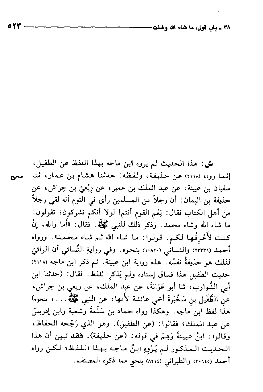 ش: هذا الحديث لم يروه ابن ماجة بهذا اللفظ عن الطفيل، إنما رواه عن حذيفة ولفظه: حدثنا هشام بن عمار ثنا سفيان بن عيينة عن عبد الملك بن عمير، عن ربعي بن حراش، عن حذيفة بن اليمان "أن رجلاً من المسلمين رأى في النوم أنه لقي رجلاً من أهل الكتاب فقال: نعم القوم أنتم لولا أنكم تشركون، تقولون: ما شاء الله وشاء محمد، وذكر ذلك للنبي صلى الله عليه وسلم فقال: "أما والله إن كنت لأعرفها لكم قولوا: ما شاء الله ثم شاء محمد" 1. ورواه أحمد والنسائي بنحوه. وفي رواية للنسائي أن الراوي لذلك هو حذيفة نفسه. هذه رواية ابن عيينة، ثم ذكر ابن ماجة حديث الطفيل هذا فساق إسناده ولم يذكر اللفظ. فقال: حدثنا ابن أبي الشوارب، ثنا ابن عوانة عن عبد الملك، عن ربعي بن حراش، عن الطفيل بن سخبرة أخي عائشة لأمها، عن النبي صلى الله عليه وسلم بنحوه، هذا لفظ ابن ماجة. وهكذا رواه حماد بن سلمة وشعبة وابن إدريس عن عبد الملك، فقالوا: عن الطفيل وهو الذي رجحه الحفاظ، وقالوا: ابن عيينة وهم في قوله: عن حذيفة فقد تبين أن هذا الحديث المذكور لم يروه ابن ماجة بهذا اللفظ، لكن رواه أحمد والطبراني بنحو مما ذكره المصنف.