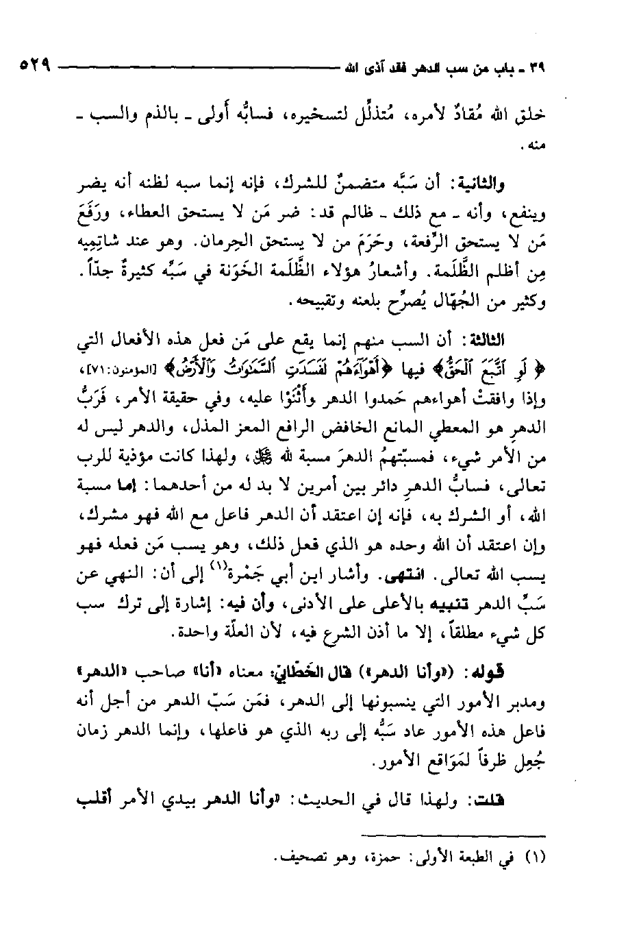 الثالثة: أن السب منهم إنما يقع على من فعل هذه الأفعال التي لو اتبع الحق فيها أهواءهم لفسدت السموات والأرض، وإذا وافقت أهواءهم حمدوا الدهر وأثنوا عليه، وفي حقيقة الأمر، فرب الدهر هو المعطي المانع الخافض الرافع المعز المذل، والدهر ليس له من الأمر شيء، فمسبتهم الدهر مسبة لله عزّ وجل ولهذا كانت مؤذية للرب تعالى، فساب الدهر دائر بين أمرين لا بد له من أحدهما: إما مسبة الله أو الشرك به، فإنه إن اعتقد أن الدهر فاعل مع الله فهو مشرك، وإن اعتقد أن الله وحده هو الذي فعل ذلك، وهو يسب من فعله فهو يسب الله تعالى. انتهى. وأشار ابن أبي جمرة1 إلى أن النهي عن سب الدهر تنبيه بالأعلى على الأدنى، وأن فيه إشارة إلى ترك سب كل شيء مطلق، إلا ما أذن الشرع فيه، لأن العلة واحدة.