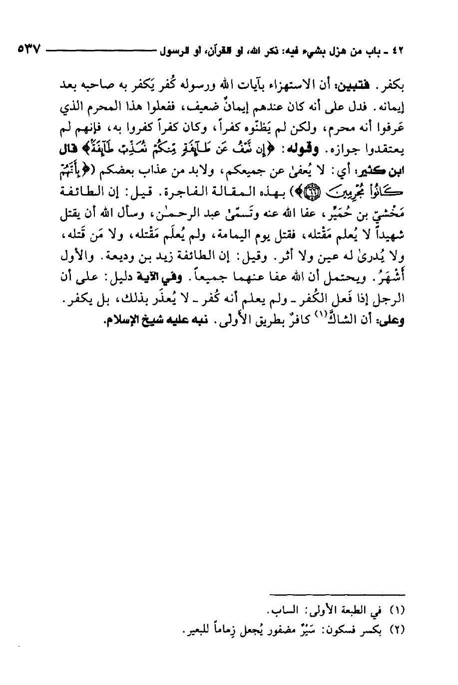 وفي الآية دليل على أن الرجل إذا فعل الكفر ولم يعلم أنه كفر لا يعذر بذلك، بل يكفر، وعلى أن الشاك2 كافر بطريق الأولى نبه عليه شيخ الإسلام.