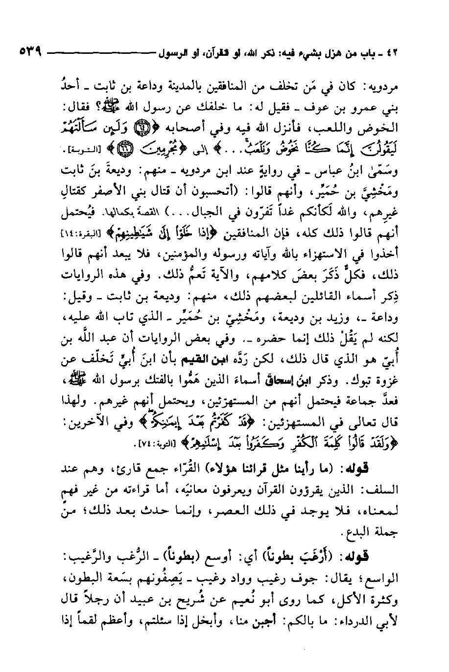 مردويه: " كان فيمن تخلف من المنافقين بالمدينة وداعه بن ثابت أحد بني عمرو بن عوف، فقيل له: ما خلفك عن رسول الله صلى الله عليه وسلم فقال: الخوض واللعب، فأنزل الله فيه وفي أصحابه {وَلَئِنْ سَأَلْتَهُمْ لَيَقُولُنَّ إِنَّمَا كُنَّا نَخُوضُ وَنَلْعَبُ ... } ".