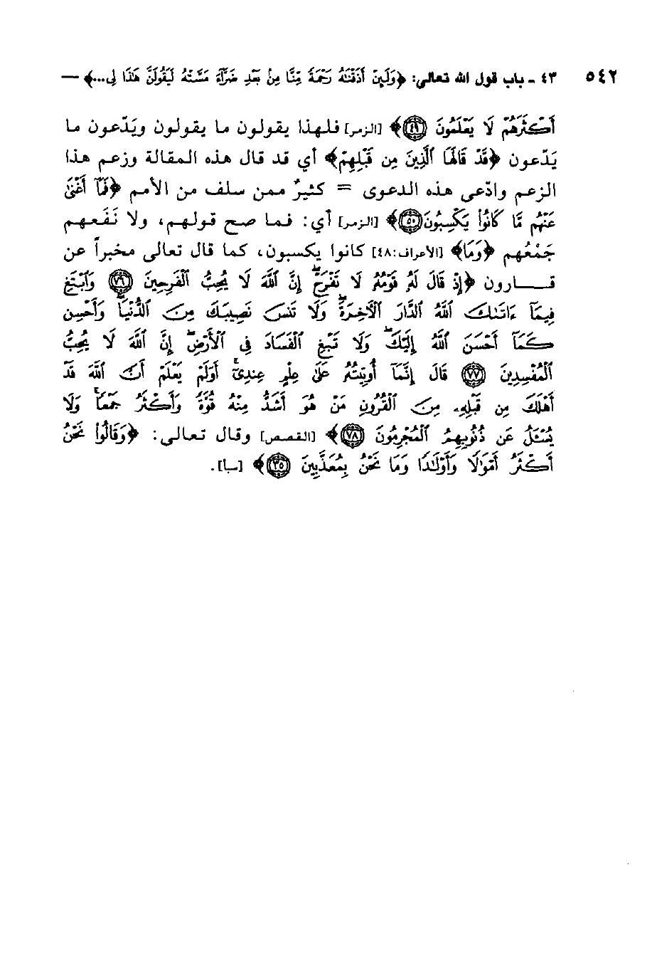 الأمم {فَمَا أَغْنَى عَنْهُمْ مَا كَانُوا يَكْسِبُونَ} 3، أي: فما صح قولهم، ولا نفعهم جمعهم وما كانوا يكسبون، كما قال تعالى مخبرًا عن قارون: {إِذْ قَالَ لَهُ قَوْمُهُ لا تَفْرَحْ إِنَّ اللَّهَ لا يُحِبُّ الْفَرِحِينَ وَابْتَغِ فِيمَا آتَاكَ اللَّهُ الدَّارَ الآخِرَةَ وَلا تَنْسَ نَصِيبَكَ مِنَ الدُّنْيَا وَأَحْسِنْ كَمَا أَحْسَنَ اللَّهُ إِلَيْكَ وَلا تَبْغِ الْفَسَادَ فِي الأَرْضِ إِنَّ اللَّهَ لا يُحِبُّ الْمُفْسِدِينَ قَالَ إِنَّمَا أُوتِيتُهُ عَلَى عِلْمٍ عِنْدِي أَوَلَمْ يَعْلَمْ أَنَّ اللَّهَ قَدْ أَهْلَكَ مِنْ قَبْلِهِ مِنَ الْقُرُونِ مَنْ هُوَ أَشَدُّ مِنْهُ قُوَّةً وَأَكْثَرُ جَمْعاً وَلا يُسْأَلُ عَنْ ذُنُوبِهِمُ الْمُجْرِمُونَ} 4. وقال تعالى: {وَقَالُوا نَحْنُ أَكْثَرُ أَمْوَالاً وَأَوْلاداً وَمَا نَحْنُ بِمُعَذَّبِينَ} 5.