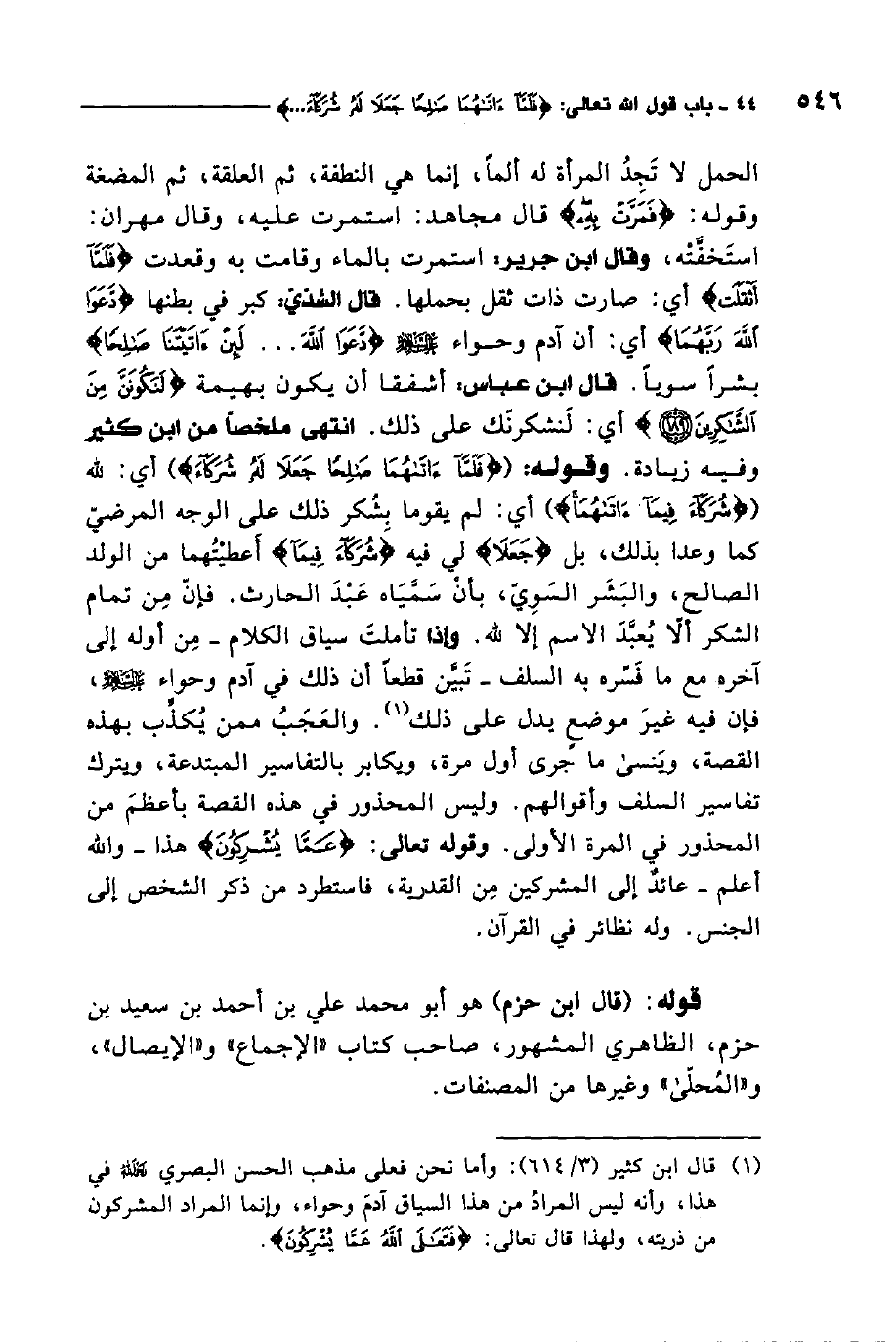 وقوله: {فَلَمَّا آتَاهُمَا صَالِحاً جَعَلا لَهُ شُرَكَاءَ} 4، أي: لله شركاء فيما آتاهما أي: لم يقوما بشكر ذلك على الوجه المرضي كما وعدا بذلك، بل جعلا لي فيه شركاء فيما أعطيتهما من الولد الصالح، والبشر السوي، بأن سمياه عبد الحارث، فإن من تمام الشكر أن لا يعبد الاسم إلا لله، وإذا تأملت سياق الكلام من أوله إلى آخره مع ما فسره به السلف تبين قطعًا أن ذلك في آدم وحواء عليهما السلام، فإن فيه غير موضع يدل على ذلك5. والعجب ممن يكذب بهذه القصة، وينسى ما جرى أول مرة ويكابر بالتفاسير المبتدعة، ويترك تفاسير السلف وأقوالهم. وليس المحذور في هذه القصة بأعظم من المحذور في المرة الأولى.