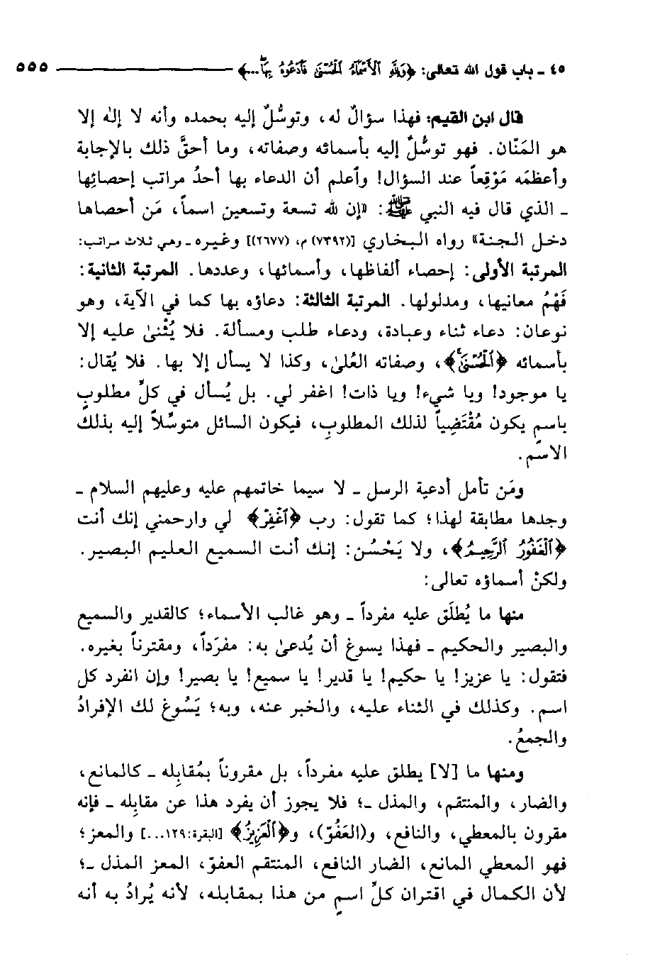 ومنها ما لا يطلق عليه مفردًا، بل مقرونًا بمقابله. كالمانع، والضار، والمنتقم، والمذل، فلا يجوز أن يفرد هذا عن مقابله، فإنه مقرون بالمعطي، والنافع، والعفو، والعزيز والمعز. فهو المعطي المانع، الضار النافع، المنتقم العفو، المعز المذل; لأن الكمال في اقتران كل اسم من هذا بمقابله، لأنه يراد به أنه