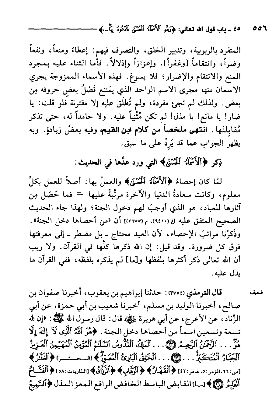 قال الترمذي: حدثنا إبراهيم بن يعقوب، أخبرنا صفوان بن صالح، أخبرنا الوليد بن مسلم أخبرنا شعيب بن أبي حمزة: عن أبي الزناد عن الأعرج عن أبي هريرة رضي الله عنه قال: قال رسول الله صلى الله عليه وسلم: "إن لله تسعة وتسعين اسمًا من أحصاها دخل الجنة هو الله الذي لا إله إلا هو. الرحمن. الرحيم. الملك القدوس. السلام. المؤمن. المهيمن. العزيز. الجبار. المتكبر. الخالق. البارئ. المصور. الغفار. القهار. الوهاب. الرزاق. الفتاح. العليم. القابض. الباسط. الخافض. الرافع. المعز. المذل. السميع.