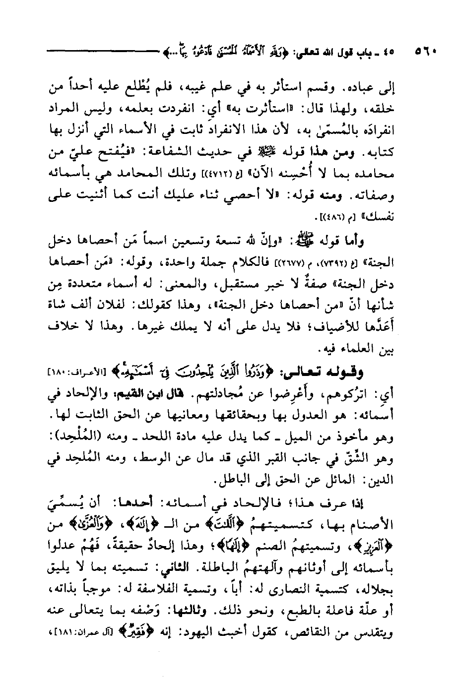 وقوله تعالى: {وَذَرُوا الَّذِينَ يُلْحِدُونَ فِي أَسْمَائِهِ} 5، أي: اتركوهم، وأعرضوا عن مجادلتهم، قال ابن القيم: والإلحاد في أسمائه: هو العدول بها وبحقائقها ومعانيها عن الحق الثابت لها، وهو مأخوذ من الميل، كما يدل عليه مادة اللحد، ومنه اللحد وهو الشق في جانب القبر الذي قد مال عن الوسط، ومنه اللمحد في الدين المائل عن الحق إلى الباطل.