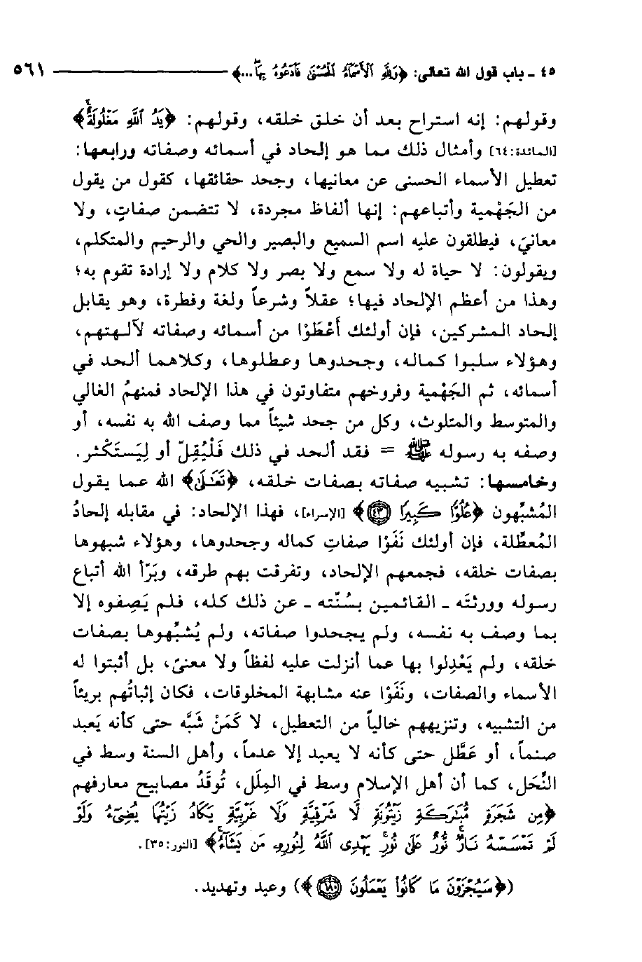 وخامسها: تشبيه صفاته بصفات خلقه، تعالى الله عما يقول المشبهون علوًّا كبيرًا، فهذا الإلحاد في مقابله إلحاد المعطلة، فإن أولئك نفوا صفات كماله وجحدوها، وهؤلاء شبهوها بصفات خلقه، فجمعهم الإلحاد، وتفرقت بهم طرقه، وبرأ الله أتباع رسوله، وورثته القائمين بسنته عن ذلك كله، فلم يصفوه إلا بما وصف به نفسه، ولم يجحدوا صفاته، ولم يشبهوها بصفات خلقه، ولم يعدلوا بها عما أنزلت عليه لفظًا ولا معنى، بل أثبتوا له الأسماء والصفات، ونفوا عنه مشابهة المخلوقات فكان إثباتهم بريئًا من التشبيه، وتنْزيههم خاليًا من التعطيل، لا كمن شبه كأنه يعبد صنمًا، أو عطل حتى كأنه لا يعبد إلا عدمًا، وأهل السنة وسط في النحل، كما أن أهل الإسلام وسط في الملل توقد مصابيح معارفهم: {مِنْ شَجَرَةٍ مُبَارَكَةٍ زَيْتُونَةٍ لا شَرْقِيَّةٍ وَلا غَرْبِيَّةٍ يَكَادُ زَيْتُهَا يُضِيءُ وَلَوْ لَمْ تَمْسَسْهُ نَارٌ نُورٌ عَلَى نُورٍ يَهْدِي اللَّهُ لِنُورِهِ مَنْ يَشَاءُ} ، [النّور، من الآية: 35] . {سَيُجْزَوْنَ مَا كَانُوا يَعْمَلُونَ} ، [الأعراف، من الآية: 180] وعيد وتهديد.