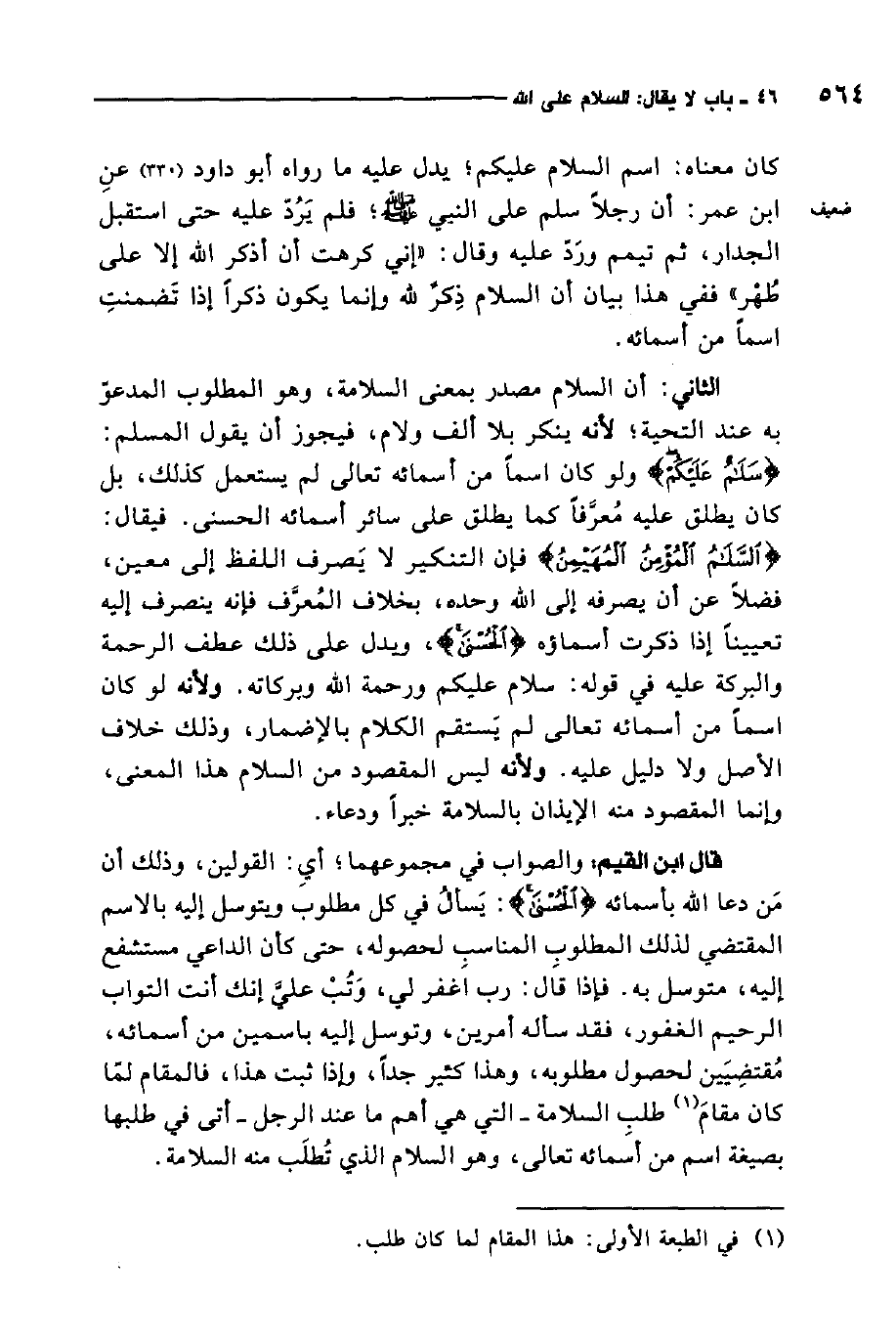 كان معناه: اسم السلام عليكم، يدل عليه ما رواه أبو داود، عن ابن عمر أن رجلاً سلم على النبي صلى الله عليه وسلم فلم يرد عليه حتى استقبل الجدار، ثم تيمم ورد عليه وقال: "إني كرهت أن أذكر الله إلا على طهر" 1. ففي هذا بيان أن السلام ذكر لله وإنما يكون ذكرًا إذا تضمنت اسمًا من أسمائه.