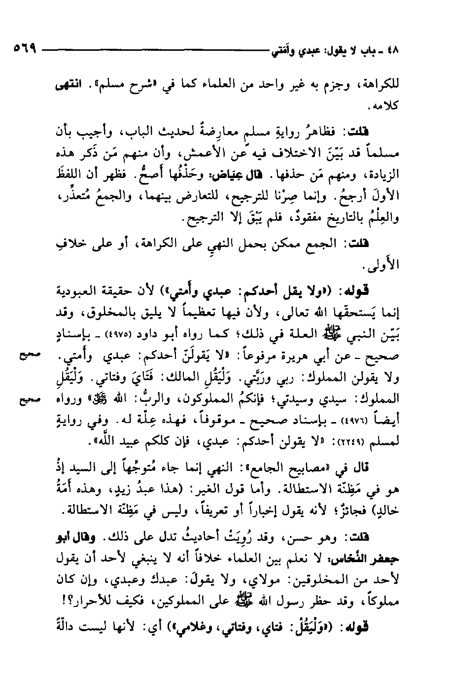 قال في"مصابيح الجامع"النهي إنما جاء متوجهًا إلى السيد إذ هو في مظنه الاستطالة، وأما قول الغير: هذا عبد زيد، وهذه أمة خالد فجائز، لأنه يقول إخبارًا أو تعريفًا، وليس في مظنة الاستطالة.