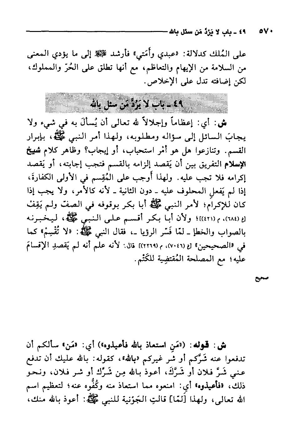 ش: قوله:"من استعاذ بالله فأعيذوه"، أي: من سألكم أن تدفعوا عنه شركم أو شر غيركم بالله، كقوله: بالله عليك أن تدفع عني شر فلان أو شرك، أعوذ بالله من شرك أو شر فلان ونحو ذلك، فأعيذوه، أي: امنعوه مما استعاذ منه وكفوه عنه لتعظيم اسم الله تعالى، ولهذا لما قالت الجونية للنبي صلى الله عليه وسلم أعوذ بالله منك