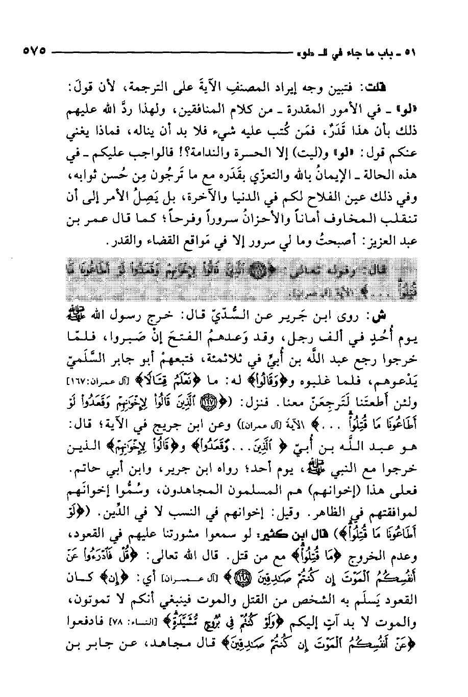 قلت: فتبين وجه إيراد المصنف الآية على الترجمة، لأن قول"لو"في الأمور المقدرة من كلام المنافقين، ولهذا رد الله عليهم ذلك بأن هذا قدر، فمن كتب عليه شيء فلا بد أن يناله، فماذا يغني عنكم قول"لو"و"ليت"إلا الحسرة والندامة؟! فالواجب عليكم في هذه الحالة الإيمان بالله والتعزي بقدره مع ما ترجون من حسن ثوابه، وفي ذلك عين الفلاح لكم في الدنيا والآخرة، بل يصل الأمر إلى أن تنقلب المخاوف أمانًا والأحزان سرورًا وفرحًا كما قال عمر بن عبد العزيز: أصبحت وما لي سرور إلا في مواقع القضاء والقدر.