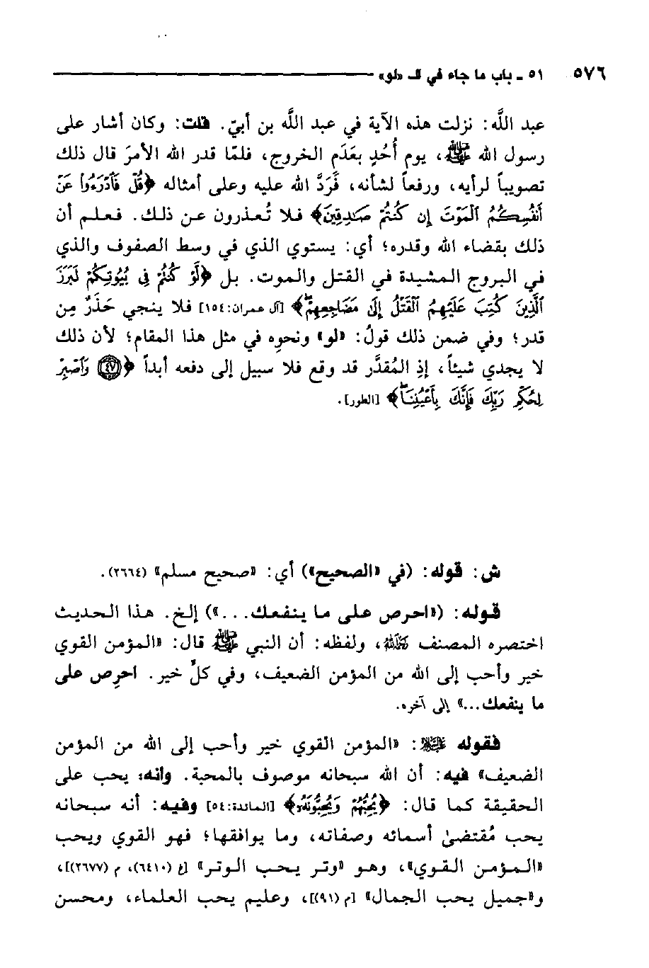 قلت: وكان أشار على رسول الله صلى الله عليه وسلم يوم أحد بعدم الخروج، فلما قدر الله الأمر قال ذلك تصويبًا لرأيه، ورفعًا لشأنه فردّ الله عليه وعلى أمثاله {قُلْ فَادْرَأُوا عَنْ أَنْفُسِكُمُ الْمَوْتَ إِنْ كُنْتُمْ صَادِقِينَ} 1. فلا تعذرون عن ذلك. فعلم أن ذلك بقضاء الله وقدره. أي: يستوي الذي في وسط الصفوف والذي في البروج المشيدة في القتل والموت. بل {لَوْ كُنْتُمْ فِي بُيُوتِكُمْ لَبَرَزَ الَّذِينَ كُتِبَ عَلَيْهِمُ الْقَتْلُ إِلَى مَضَاجِعِهِمْ} 2، فلا ينجي حذر من قدر. وفي ضمن ذلك قول"لو"ونحوه في مثل هذا المقام; لأن ذلك لا يجدي شيئًا؛ إذ المقدر قد وقع فلا سبيل إلى دفعه أبدًا. {وَاصْبِرْ لِحُكْمِ رَبِّكَ فَإِنَّكَ بِأَعْيُنِنَا} 3.