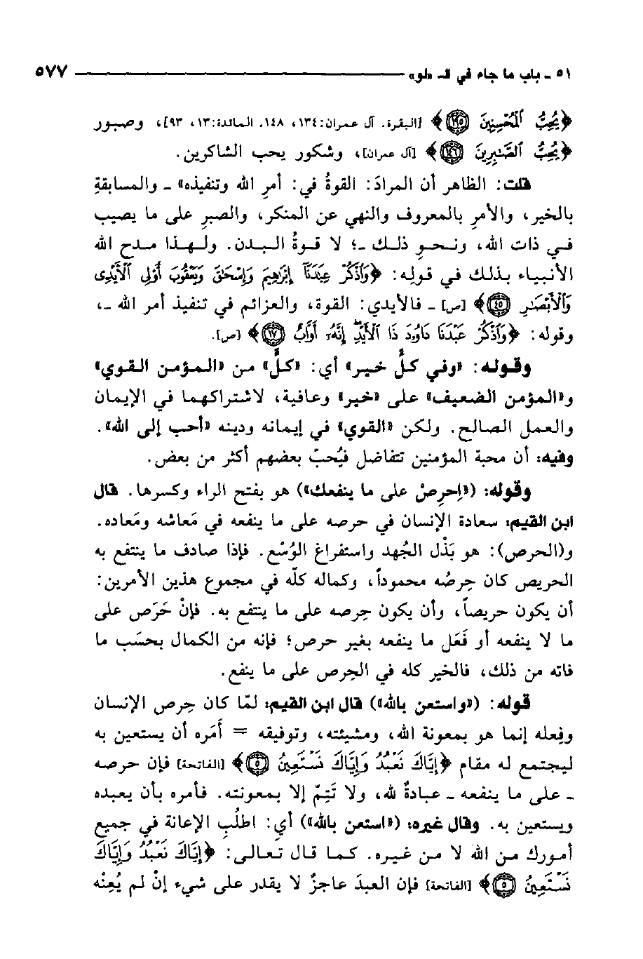 قوله:"واستعن بالله". قال ابن القيم: "لما كان حرص الإنسان وفعله إنما هو بمعونة الله، ومشيئته، وتوفيقه، أمره أن يستعين به ليجتمع له مقام {إِيَّاكَ نَعْبُدُ وَإِيَّاكَ نَسْتَعِينُ} ، [الفاتحة: 5] ، فإن حرصه على ما ينفعه عبادة لله، ولا تتم إلا بمعونته. فأمره بأن يعبده ويستعين به.