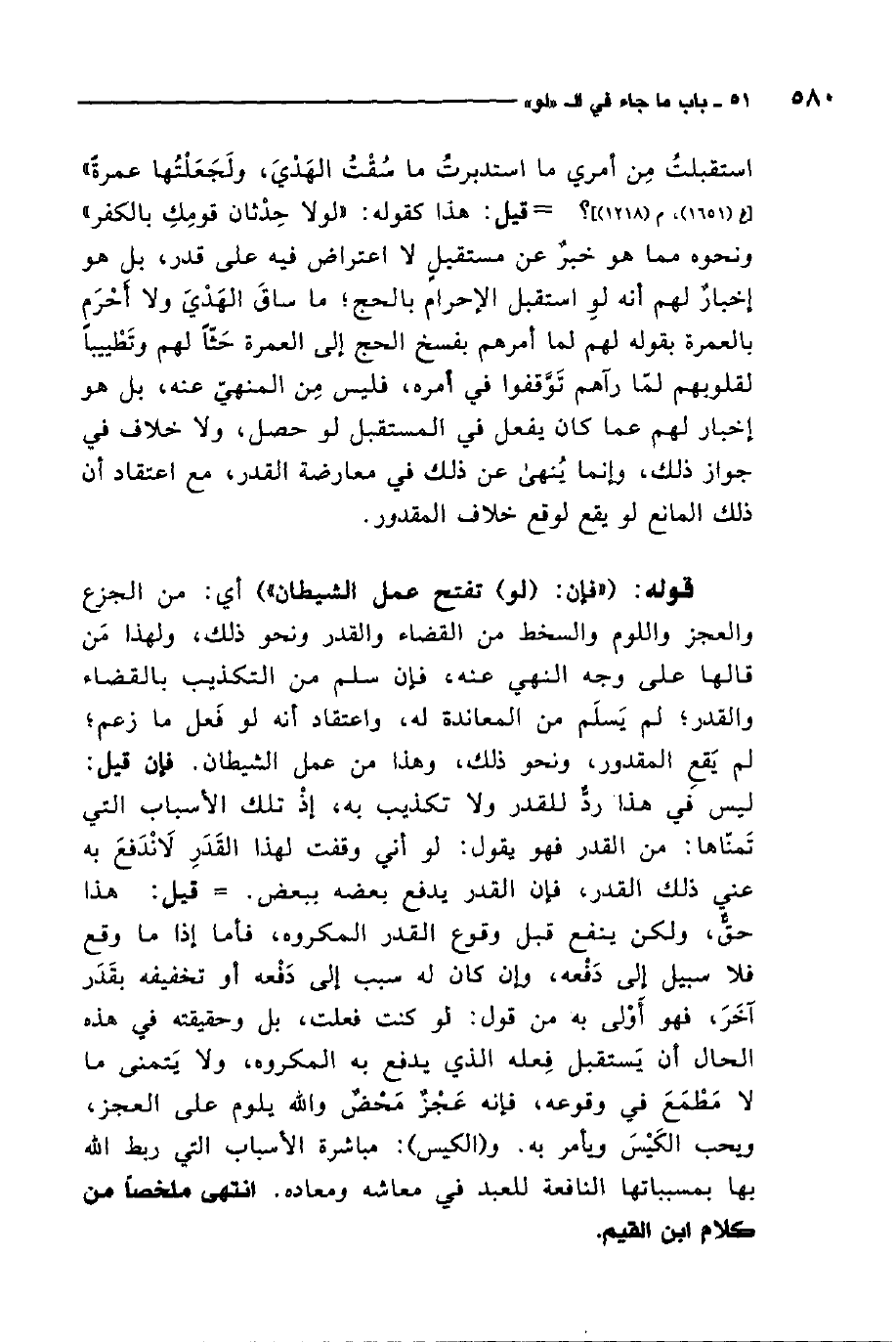 استقبلت من أمري ما استدبرت ما سقت الهدي، ولجعلتها عمرة؟ " 1. قيل: هذا كقوله: "لولا حدثان قومك بالكفر" 2. ونحوه مما هو خبر عن مستقبل لا اعتراض فيه على قدر، بل هو إخبار لهم أنه لو استقبل الإحرام بالحج; ما ساق الهدي ولا أحرم بالعمرة، بقوله لهم لما أمرهم بفسخ الحج إلى العمرة حثًا لهم وتطييبًا لقلوبهم لما رآهم توقفوا في أمره، فليس من المنهي عنه، بل هو إخبار لهم عما كان يفعل في المستقبل لو حصل، ولا خلاف في جواز ذلك، وإنما ينهى عن ذلك في معارضة القدر مع اعتقاد أن ذلك المانع لو يقع لوقع خلاف المقدور.