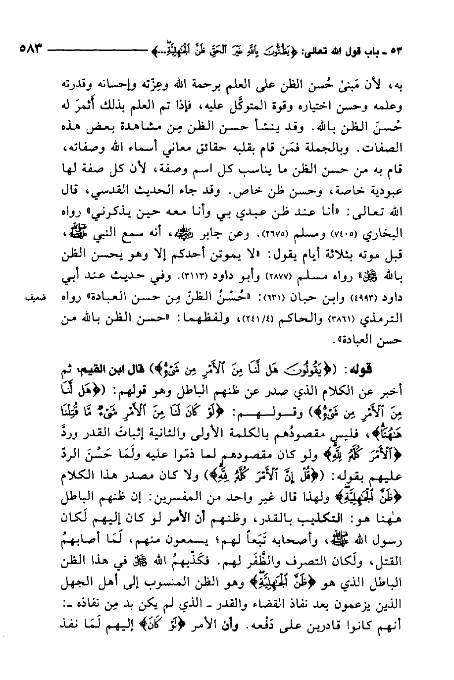 قوله: {يَقُولُونَ هَلْ لَنَا مِنَ الأَمْرِ مِنْ شَيْءٍ} 5. قال ابن القيم: ثم أخبر عن الكلام الذي صدر عن ظنهم الباطل وهو قولهم: {هَلْ لَنَا مِنَ الأَمْرِ مِنْ شَيْءٍ} 6. وقولهم: {لَوْ كَانَ لَنَا مِنَ الأَمْرِ شَيْءٌ مَا قُتِلْنَا هَاهُنَا} 7. فليس مقصودهم بالكلمة الأولى والثانية إثبات القدر ورد الأمر كله لله، ولو كان مقصودهم لما ذموا عليه، ولما حسن الرد عليهم بقوله: {قُلْ إِنَّ الأَمْرَ كُلَّهُ لِلَّهِ} 8. ولا كان مصدر هذا الكلام ظن الجاهلية، ولهذا قال غير واحد من المفسرين: إن ظنهم الباطل ههنا هو التكذيب بالقدر، وظنهم أن الأمر لو كان إليهم لكان رسول الله صلى الله عليه وسلم وأصحابه تبعًا لهم يسمعون منهم، لما أصابهم القتل، ولكان التصرف والظفر لهم، فكذبهم الله عزّ وجل في هذا الظن الباطل الذي هو ظن الجاهلية، وهو الظن المنسوب إلى أهل الجهل الذين يزعمون بعد نفاذ القضاء والقدر الذي لم يكن بد من نفاذه: أنهم كانوا قارين على دفعه وأن الأمر لو كان إليهم لما نفذ