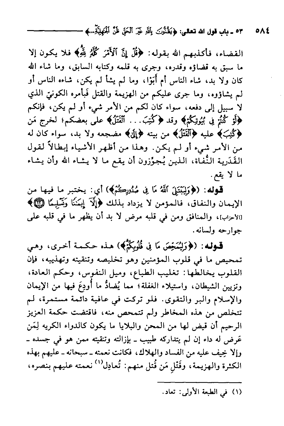 القضاء، فأكذبهم الله بقوله: {قُلْ إِنَّ الأَمْرَ كُلَّهُ لِلَّهِ} 1. فلا يكون إلا ما سبق به قضاؤه وقدره، وجرى به قلمه وكتابه السابق، وما شاء الله كان ولا بد، شاء الناس أم أبوا، وما لم يشأ لم يكن، شاءه الناس أو لم يشاؤوه، وما جرى عليكم من الهزيمة والقتل فبأمره الكوني الذي لا سبيل إلى دفعه، سواء كان لكم من الأمر شيء أو لم يكن، فإنكم لو كنتم في بيوتكم وقد كتب القتل على بعضكم; لخرج من كتب عليه القتل من بيته إلى مضجعه ولا بد، سواء كان له من الأمر شيء أو لم يكن. وهذا من أظهر الأشياء إبطالاً لقول القدرية النفاة، الذين يجوزون أن يقع ما لا يشاء الله وأن يشاء ما لا يقع.