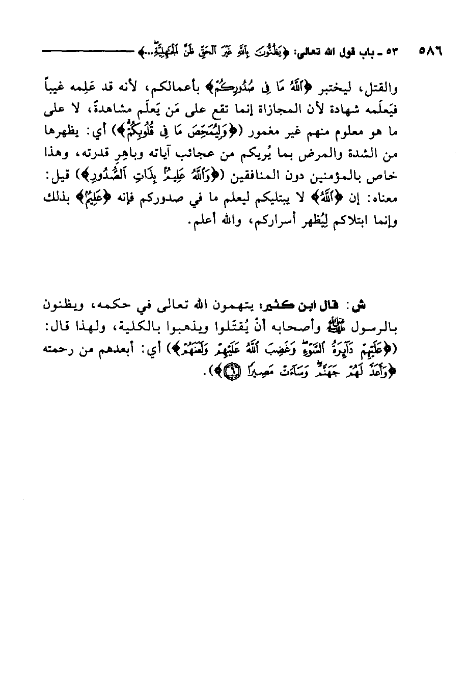 ش: قال ابن كثير: يتهمون الله تعالى في حكمه، ويظنون بالرسول صلى الله عليه وسلم وأصحابه أن يقتلوا ويذهبوا بالكلية، ولهذا قال: {عَلَيْهِمْ دَائِرَةُ السَّوْءِ وَغَضِبَ اللَّهُ عَلَيْهِمْ وَلَعَنَهُمْ} 4