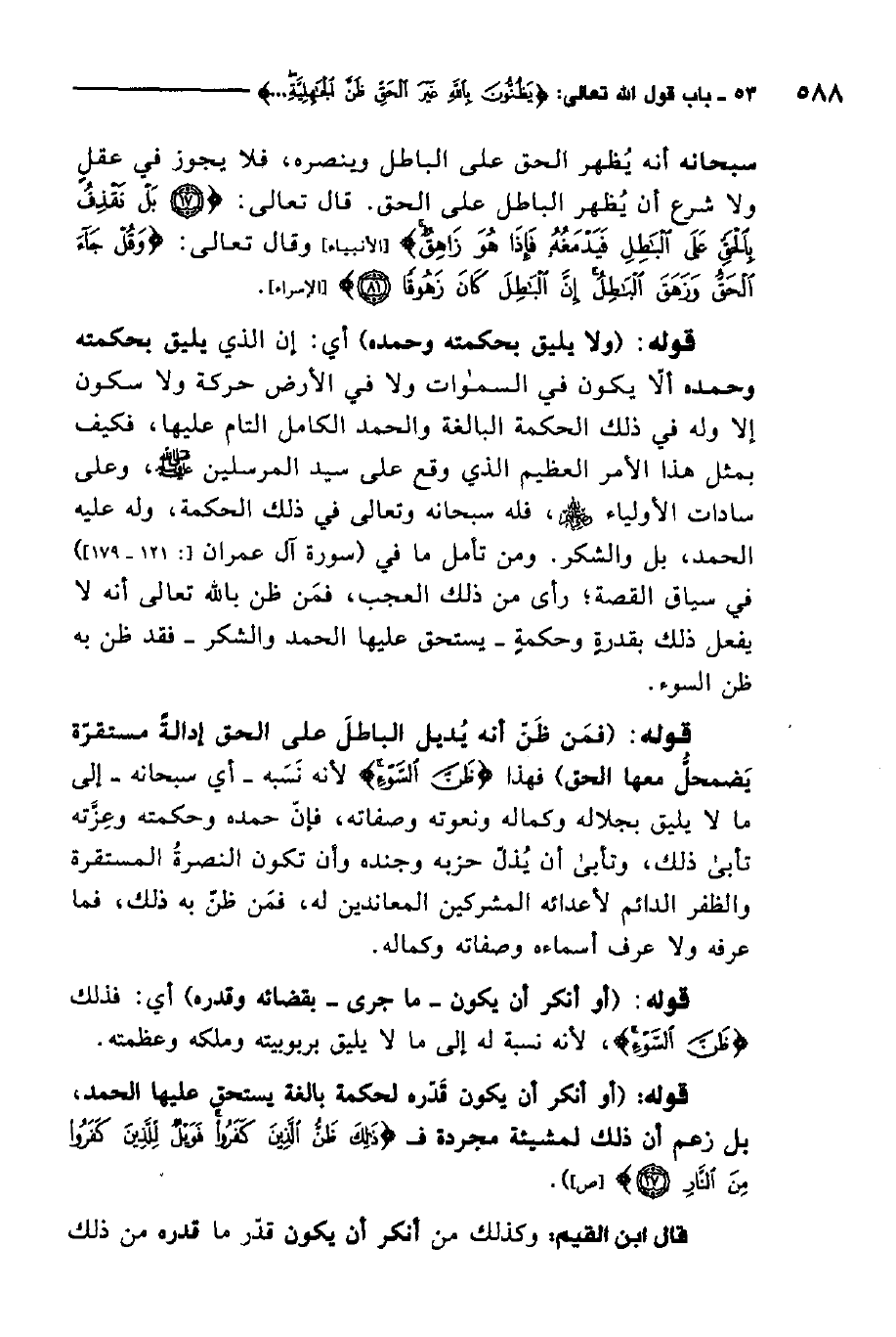 قوله:"فمن ظن أنه يديل الباطل على الحق إدالة مستقرة يضمحل معها الحق"، فهذا ظن السوء، لأنه نسبه - أي سبحانه - إلى ما لا يليق بجلاله وكماله ونعوته وصفاته، فإن حمده وحكمته وعزته تأبى ذلك، وتأبى أن يذل حزبه وجنده وأن تكون النصرة المستقرة والظفر الدائم لأعدائه المشركين المعاندين له، فمن ظن به ذلك، فما عرفه ولا عرف أسماءه وصفاته وكماله.
