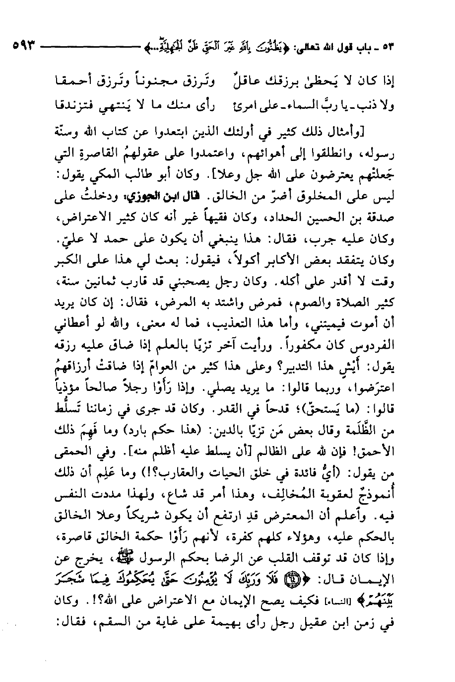 واعلم أن المعترض قد ارتفع أن يكون شريكًا وعلا الخالق بالحكم عليه، وهؤلاء كلهم كفرة، لأنهم رأوا حكمة الخالق قاصرة، وإذا كان قد توقف القلب عن الرضى بحكم الرسول صلى الله عليه وسلم يخرج عن الإيمان. قال: {فَلا وَرَبِّكَ لا يُؤْمِنُونَ حَتَّى يُحَكِّمُوكَ فِيمَا شَجَرَ بَيْنَهُمْ} 1. فكيف يصح الإيمان مع الاعتراض على الله؟ وكان في زمن ابن عقيل رجل رأى بهيمة على غاية من السقم، فقال: