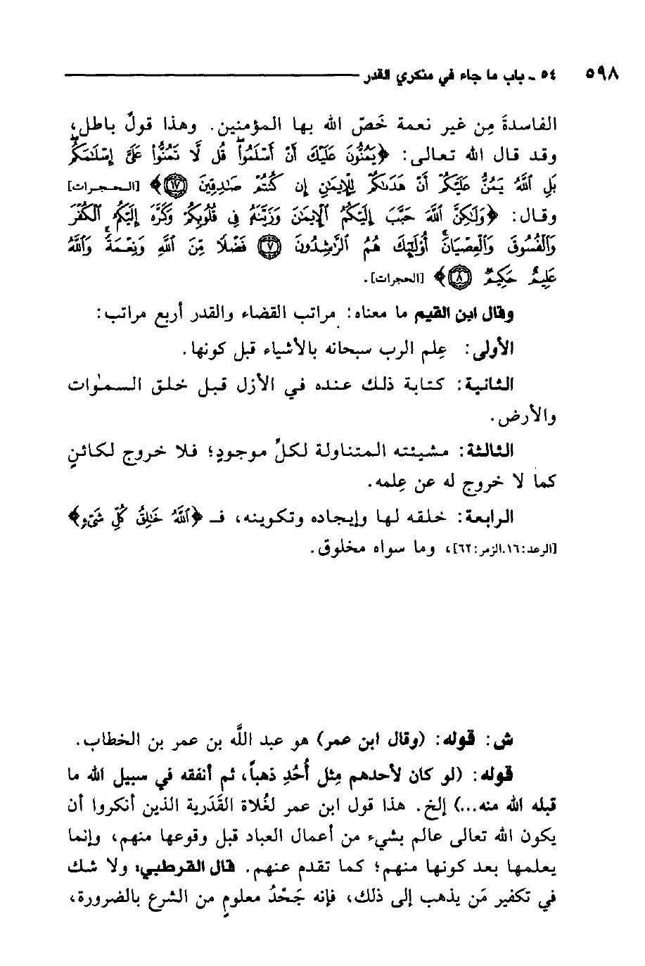 وقال ابن القيم ما معناه: مراتب القضاء والقدر أربع مراتب: