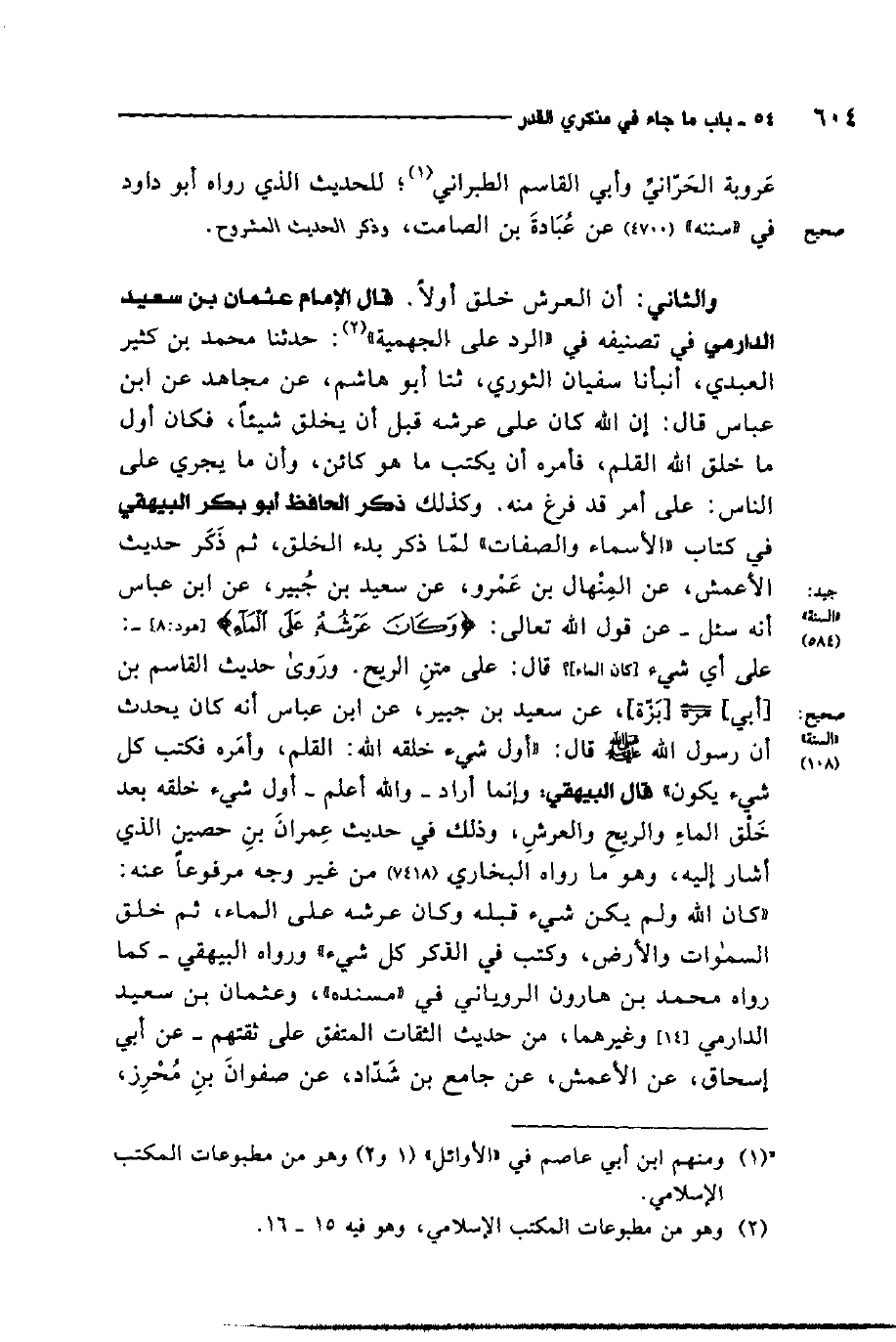 والثاني: أن العرش خلق أولاً. قال الإمام عثمان بن سعيد الدارمي في تصنيفه في"الرد على الجهمية1": حدثنا محمد بن كثير العبدي، أنبأنا سفيان الثوري، ثنا أبو هاشم، عن مجاهد، عن ابن عباس قال:"إن الله كان على عرشه قبل أن يخلق شيئًا، فكان أول ما خلق الله القلم، فأمره أن يكتب ما هو كائن، وأن ما يجري على الناس على أمر قد فرغ منه" وكذلك ذكر الحافظ أبو بكر البيهقي في كتاب"الأسماء والصفات"لما ذكر بدء الخلق، ثم ذكر حديث الأعمش، عن المنهال بن عمرو، عن سعيد بن جبير،"عن ابن عباس أنه سئل عن قول الله تعالى: {وَكَانَ عَرْشُهُ عَلَى الْمَاءِ} 2. على أي شيء [كان الماء] ؟ قال: على متن الريح". وروى حديث القاسم بن [أبي بزة] ، عن سعيد بن جبير، عن ابن عباس أنه كان يحدث أن رسول الله صلى الله عليه وسلم قال: "أول شيء خلقه الله القلم، وأمره فكتب كل شيء يكون" قال البيهقي: "وإنما أراد - والله أعلم - أول شيء خلقه بعد خلق الماء والريح والعرش، وذلك في حديث عمران بن حصين الذي أشار إليه، وهو ما رواه البخاري من غير وجه مرفوعًا عنه: "كان الله ولم يكن شيء قبله وكان عرشه على الماء، ثم خلق السموات والأرض، وكتب في الذكر كل شيء" 3. ورواه البيهقي كما رواه محمد بن هارون الروياني في"مسنده"وعثمان بن سعيد الدارمي وغيرهما، من حديث الثقات المتفق على ثقتهم، عن أبي إسحاق، عن الأعمش، عن جامع بن شداد، عن صفوان بن محرز،