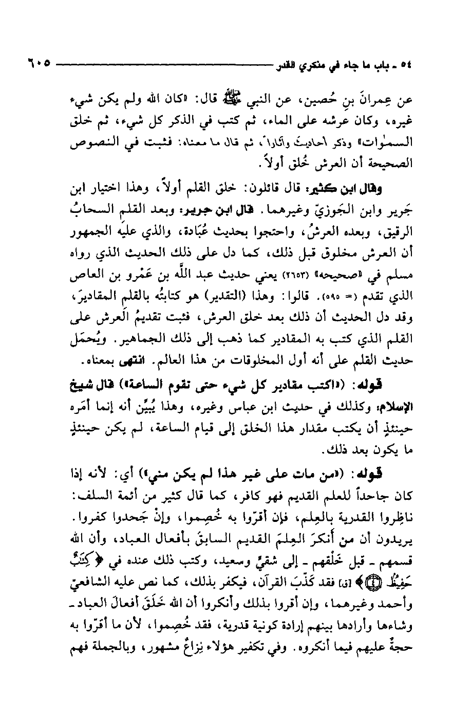 قوله:"من مات على غير هذا لم يكن مني". أي: لأنه إذا كان جاحدًا للعلم القديم فهو كافر، كما قال كثير من أئمة السلف: ناظروا القدرية بالعلم، فإن أقروا به خصموا، وإن جحدوا كفروا. يريدون أن من أنكر العلم القديم السابق بأفعال العباد، وأن الله قسمهم قبل خلقهم إلى شقي وسعيد، وكتب ذلك عنده في كتاب حفيظ، فقد كذب القرآن، فيكفر بذلك، كما نص عليه الشافعي وأحمد وغيرهما، وإن أقروا بذلك وأنكروا أن الله خلق أفعال العباد، وشاءها وأرادها بينهم إرادة كونية قدرية، فقد خصموا، لأن ما أقروا به حجة عليهم فيما أنكروه. وفي تكفير هؤلاء نزاع مشهور، وبالجملة فهم
