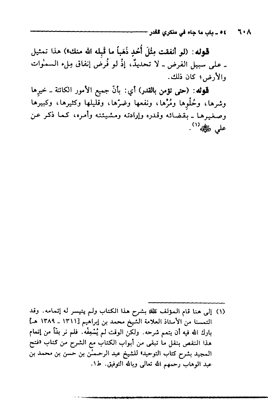 1 إلى هنا قام المؤلف رحمه الله بشرح هذا الكتاب ولم يتيسر له إتمامه, وقد التمسنا من الأستاذ العلامة الشيخ محمد بن إبراهيم بارك الله فيه أن يتمم شرحه, ولكن الوقت لم يسعفه, فلم نر بدا من إتمام هذا النقص بنقل ما تبقى من أبواب الكتاب مع الشرح من كتاب "فتح المجيد شرح كتاب التوحيد "للشيخ عبد الرحمن بن حسن بن محمد بن عبد الوهاب رحمهم الله تعالى وبالله التوفيق.