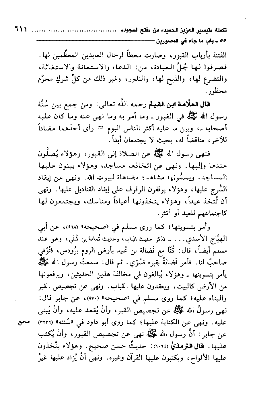 وأمر بتسويتها، كما روى مسلم في"صحيحه"عن أبي الهياج الأسدي ... - فذكر حديث الباب - وحديث ثمامة بن شفي، وهو عند مسلم أيضًا قال:"كنا مع فضالة بن عبيد بأرض الروم برودس، فتوفي صاحب لنا، فأمر فضالة بقبره فسوي، ثم قال: "سمعت رسول الله صلى الله عليه وسلم يأمر بتسويتها" 1. وهؤلاء يبالغون في مخالفة هذين الحديثين، يرفعونها عن الأرض كالبيت، ويعقدون عليها القباب. ونهى عن تجصيص القبر والبناء عليه، كما روى مسلم في"صحيحه"عن جابر رضي الله عنه قال: "نهى رسول الله صلى الله عليه وسلم عن تجصيص القبر، وأن يقعد عليه، وأن يبنى عليه ونهى عن الكتابة عليها" 2.