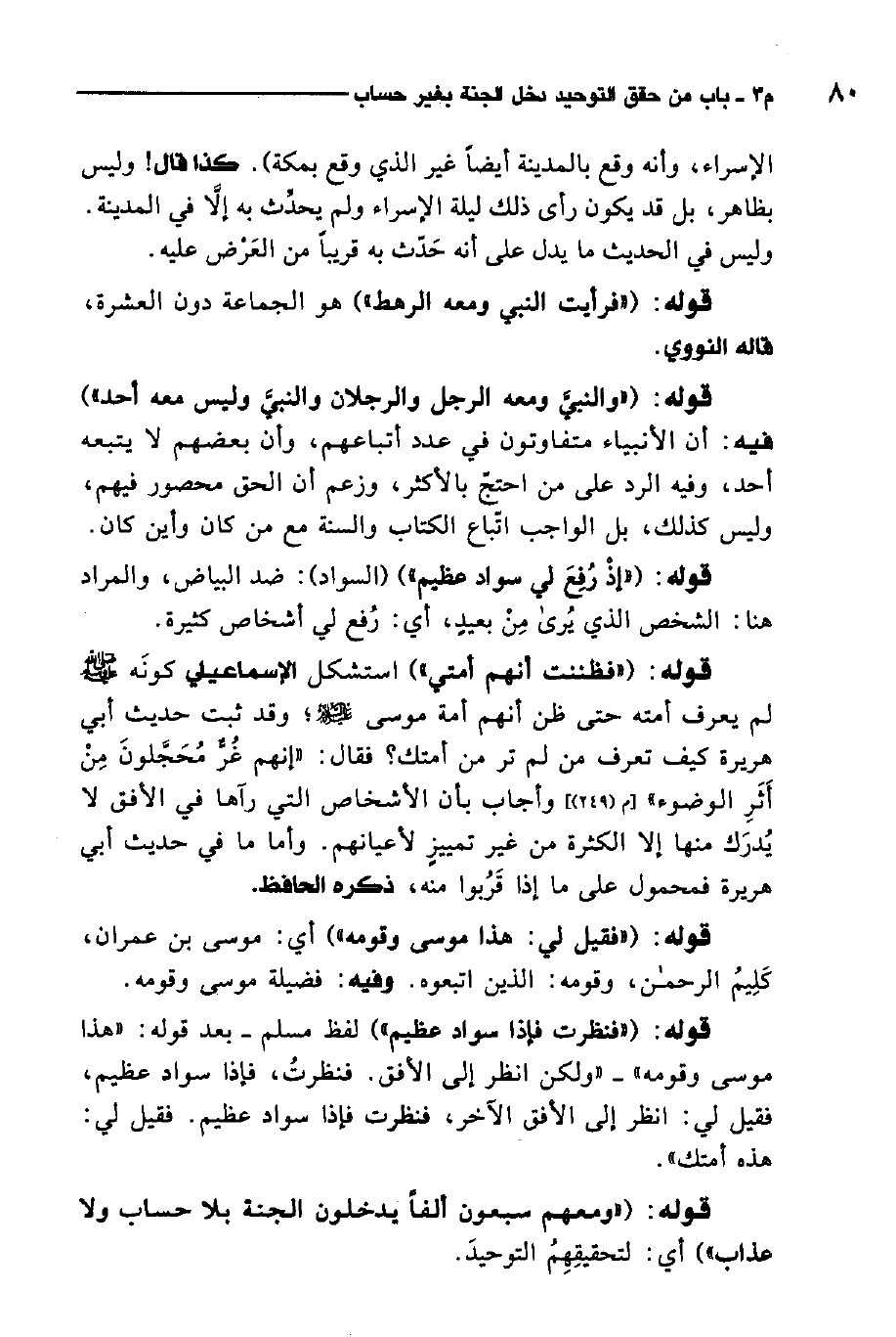 قوله: (والنبي ومعه الرجل والرجلان والنبي وليس معه أحد) . فيه أن الأنبياء متفاوتون في عدد أتباعهم، وأن بعضهم لا يتبعه أحد، وفيه الرد على من احتج بالأكثر، وزعم أن الحق محصور فيهم، وليس كذلك، بل الواجب اتباع الكتاب والسنة مع من كان وأين كان.
