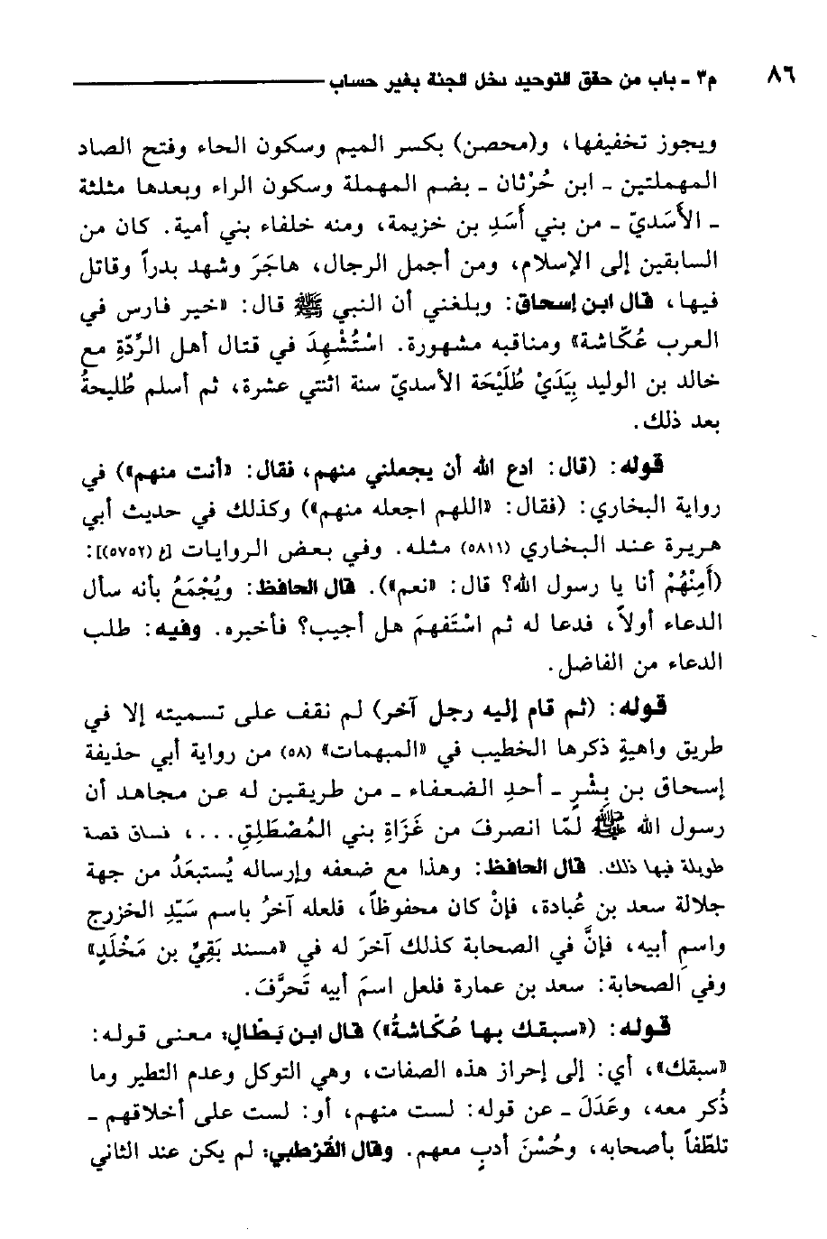 ويجوز تخفيفها. ومحصن بكسر الميم وسكون الخاء وفتح الصاد المهملتين - ابن حرثان- بضم المهملة وسكون الراء وبعدها مثلثة- الأسدي من بني أسد بن خزيمة ومنه خلفاء بني أمية، كان من السابقين إلى الإسلام، ومن أجمل الرجال - هاجر وشهد بدرا وقاتل فيها. قال ابن إسحاق: وبلغني أن النبي صلى الله عليه وسلم قال:- "خير فارس في العرب عكاشة". ومناقبه مشهورة استشهد في قتال أهل الردة مع خالد بن الوليد بيدي طليحة الأسدي سنة اثنتي عشرة ثم أسلم طليحة بعد ذلك.